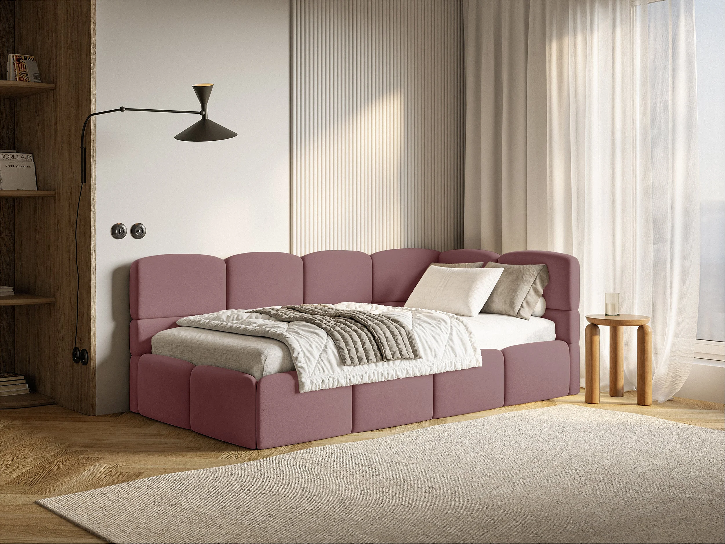 Lit ado 120x200 cm – tête de lit à droite – matelas & coffre de rangement – velours rose – CLOUDY