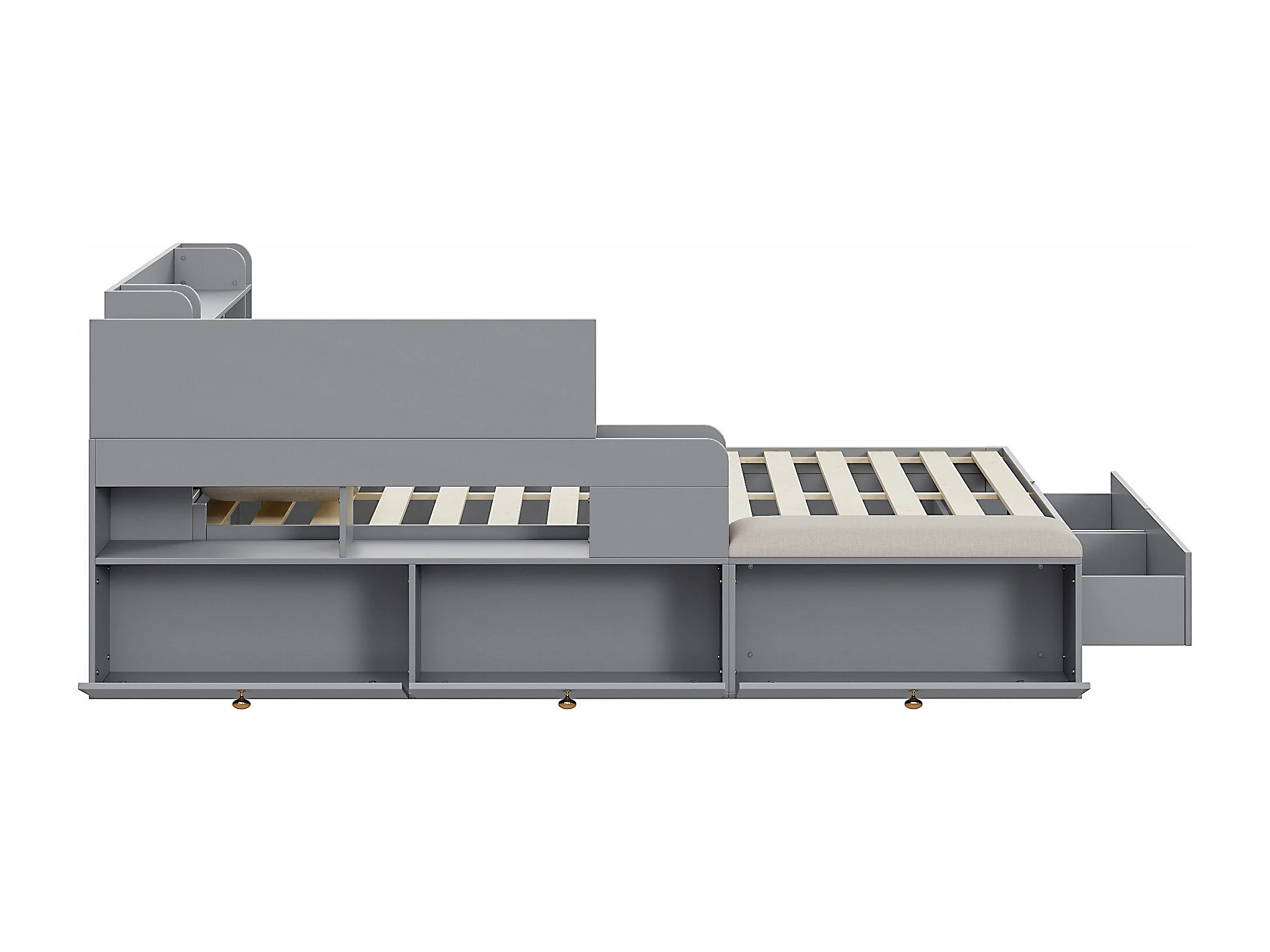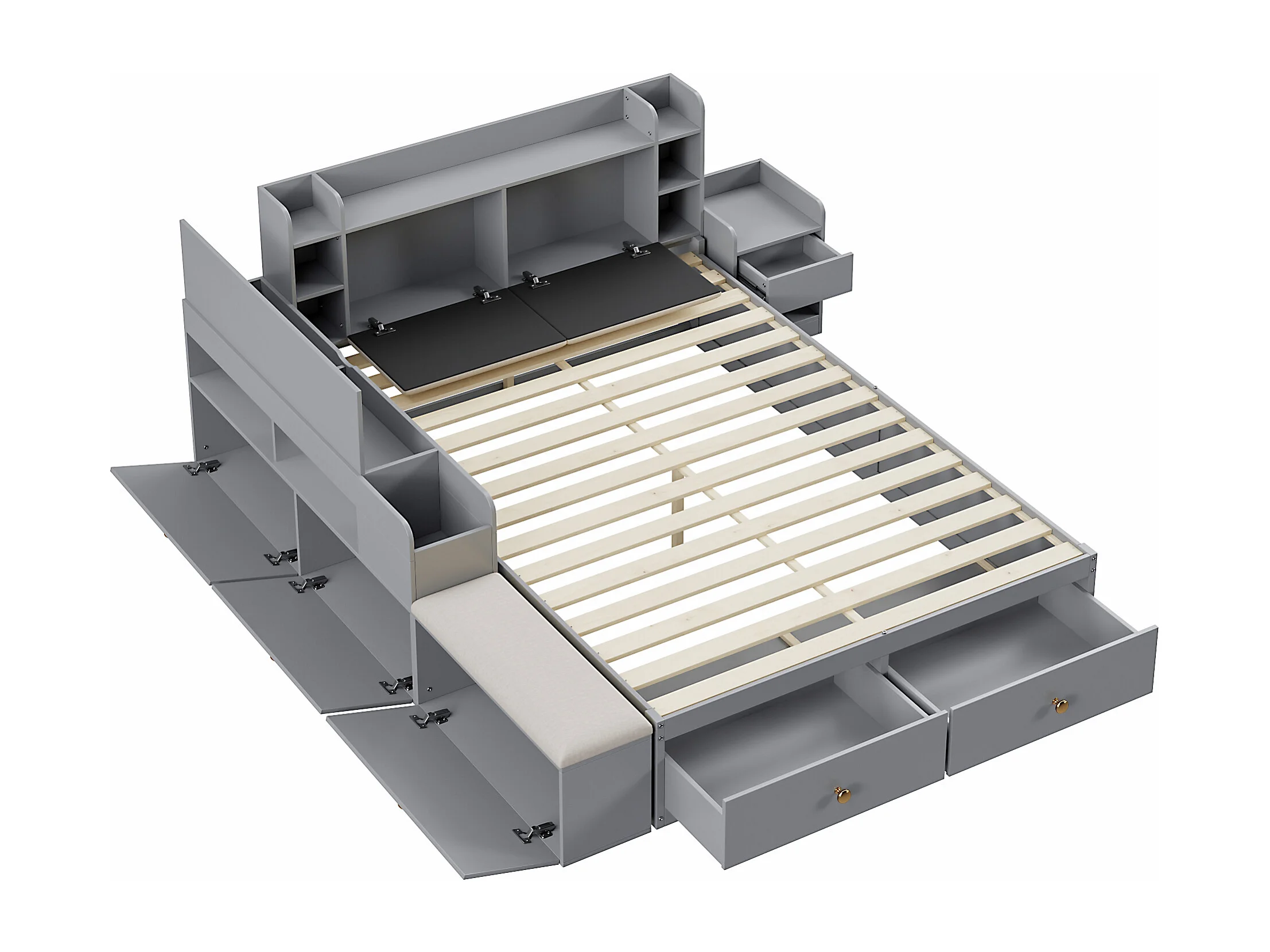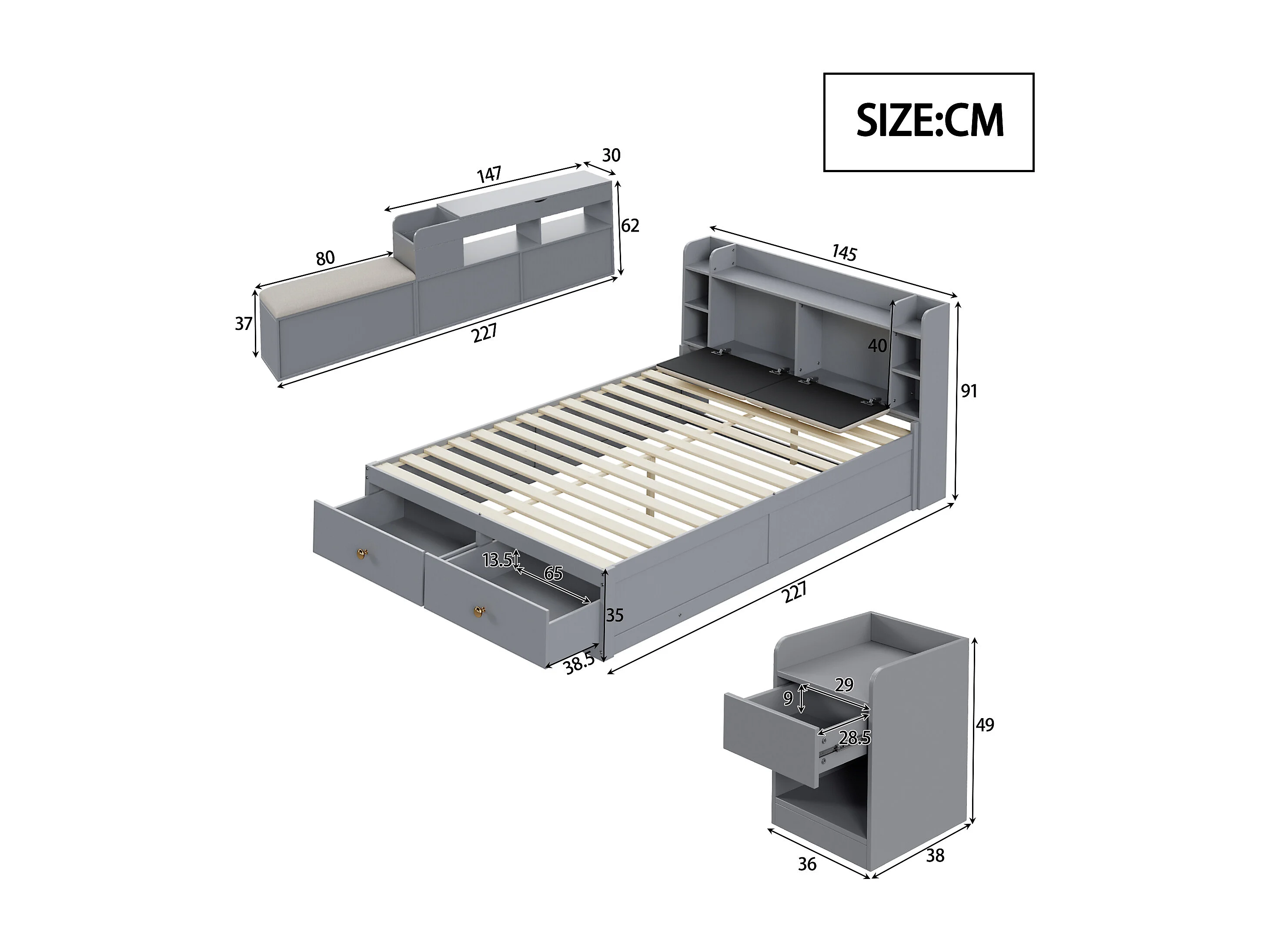 Lit adulte 140 x 200 cm avec rangement et 1 table de chevet, banc - Gris
