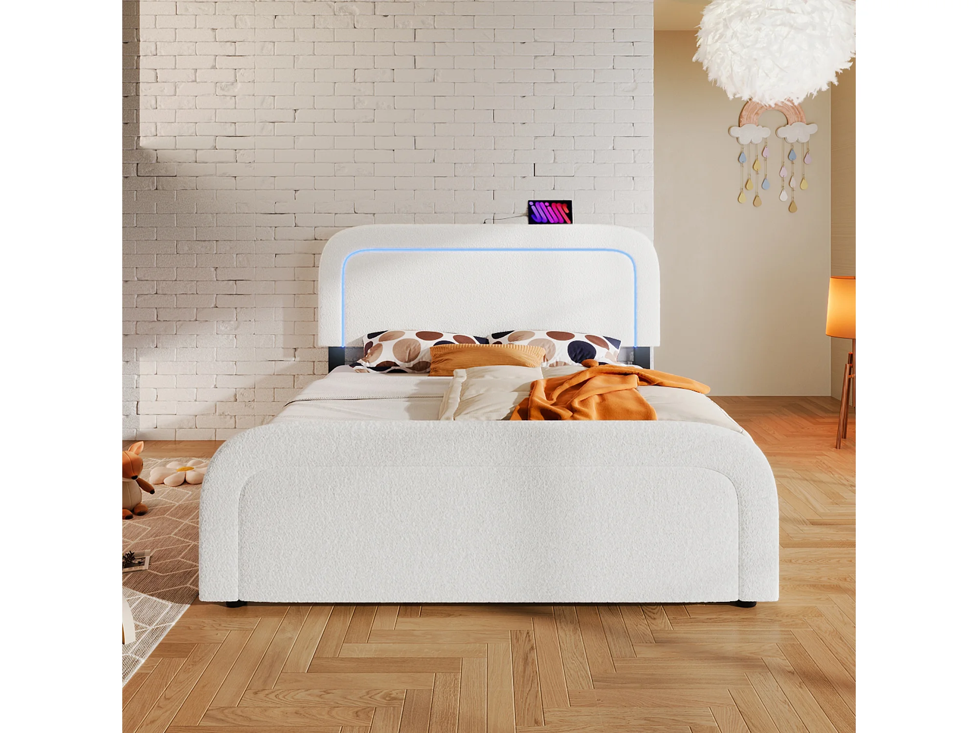 Lit adulte 140 x 200 cm avec tête de lit réglable - USB + Type C + LEDs - Tissu sherpa - blanc - gris + Matelas