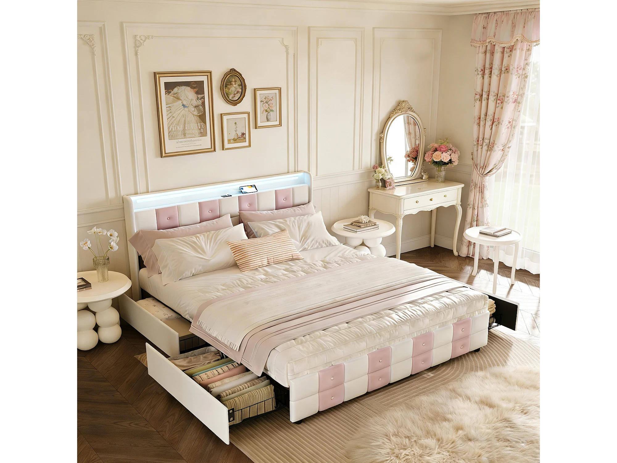 Lit adulte 140x190 tiroir - tissu velours - USB et Type C - lit double 140x200 cm avec sommier à latte - LED - Matelassage et boutons - blanc et rose