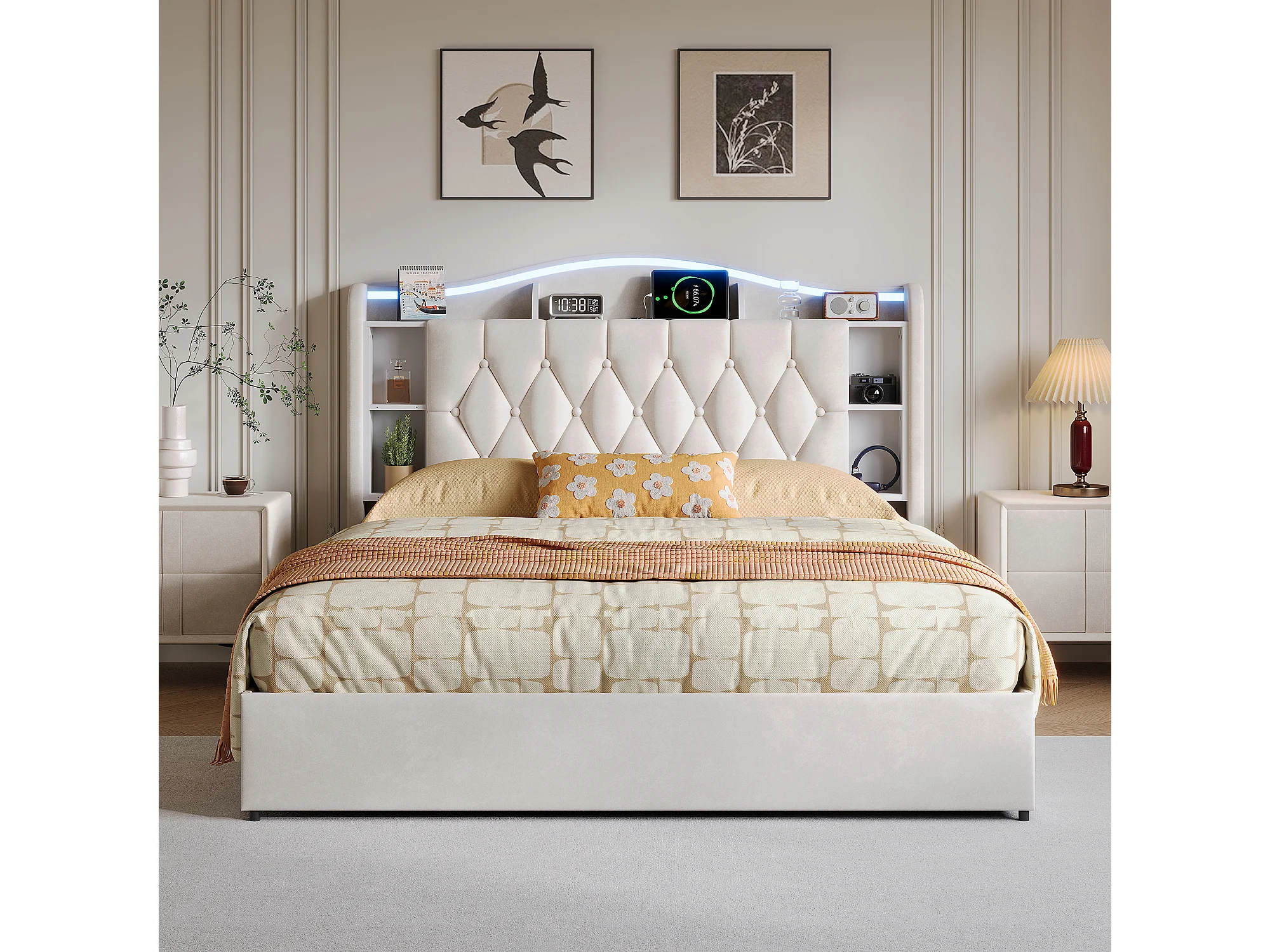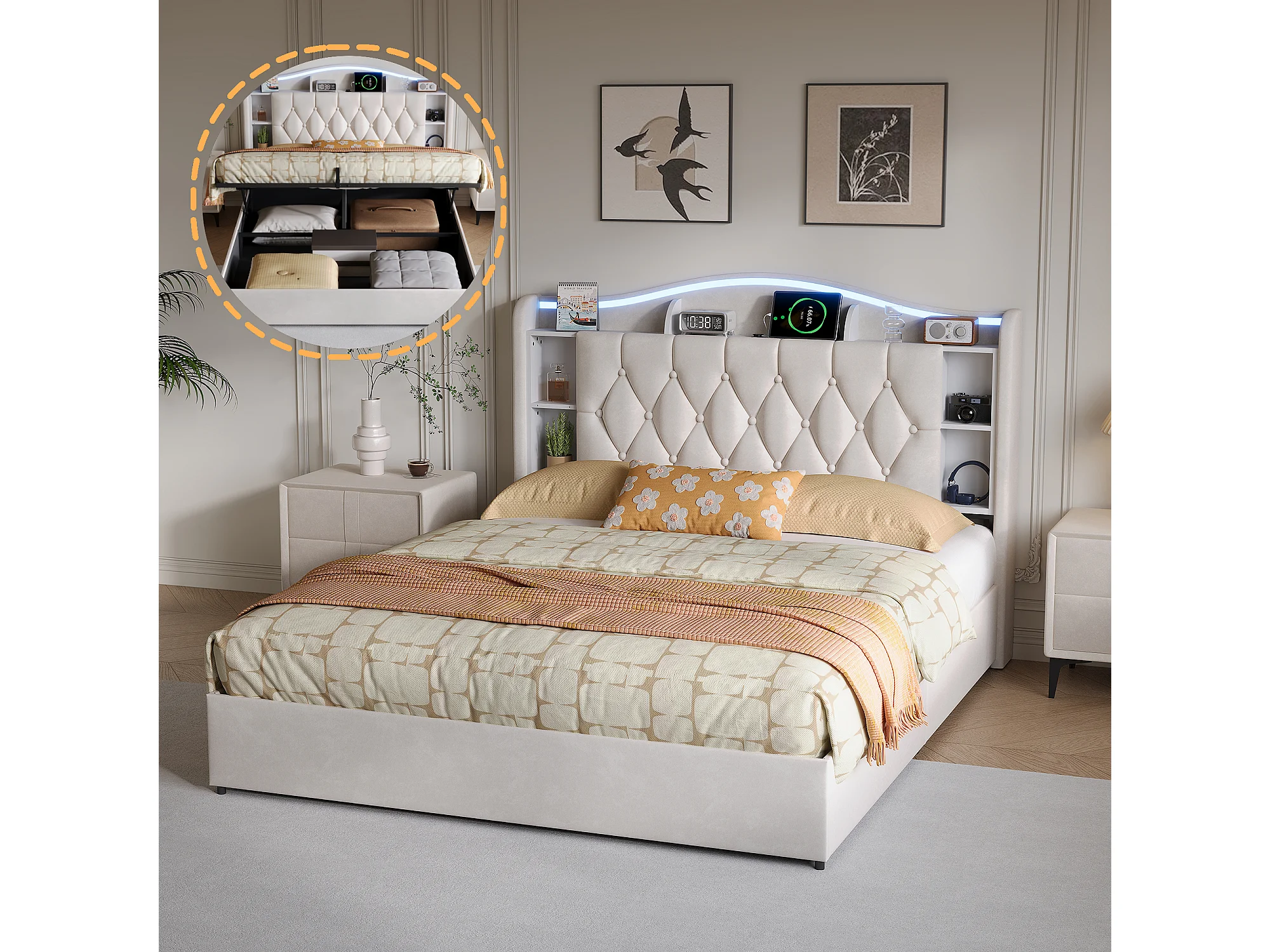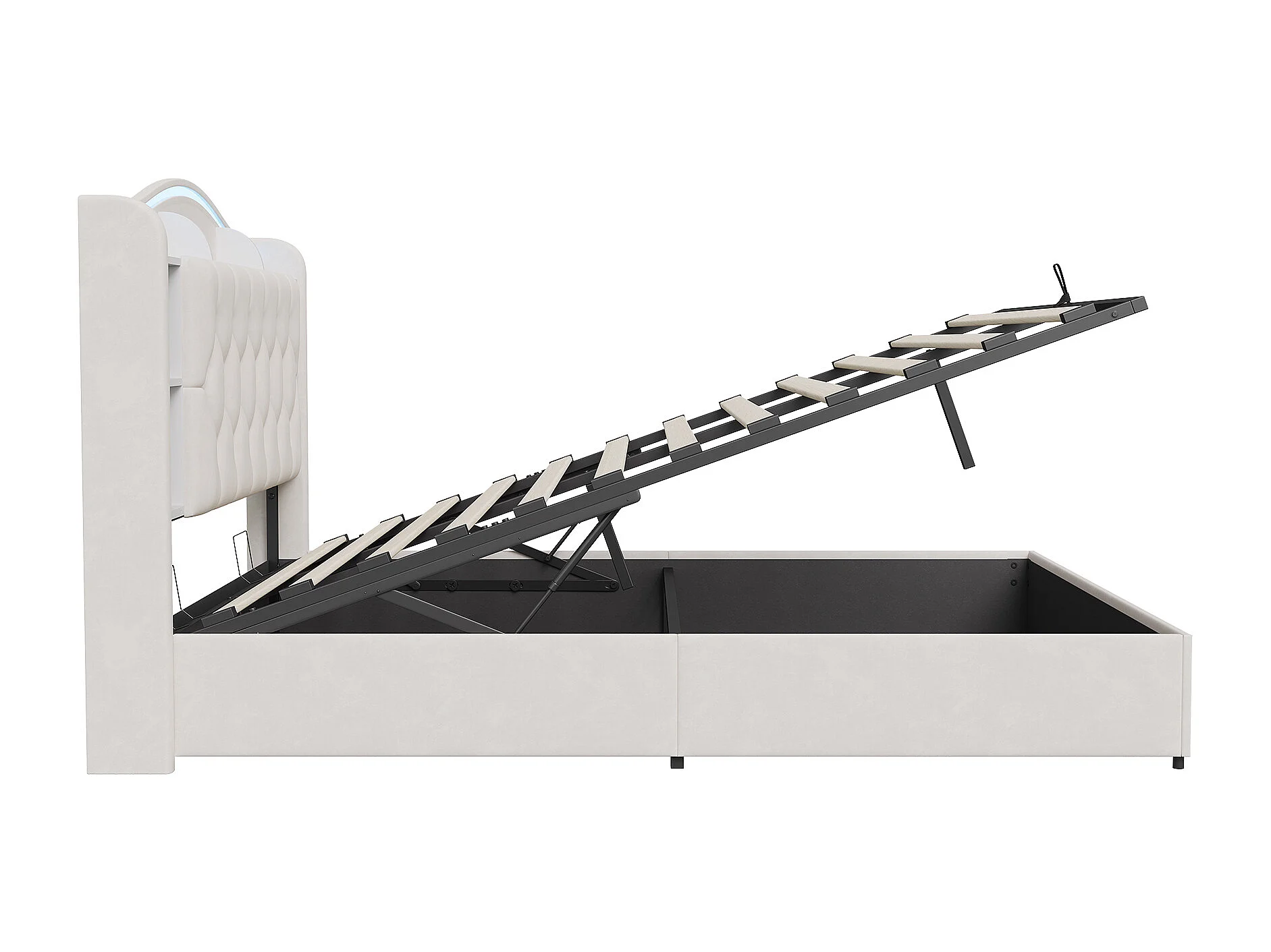 Lit adulte 140x190cm avec éclairage LED et ports USB - rangement hydraulique - velours - style moderne - beige