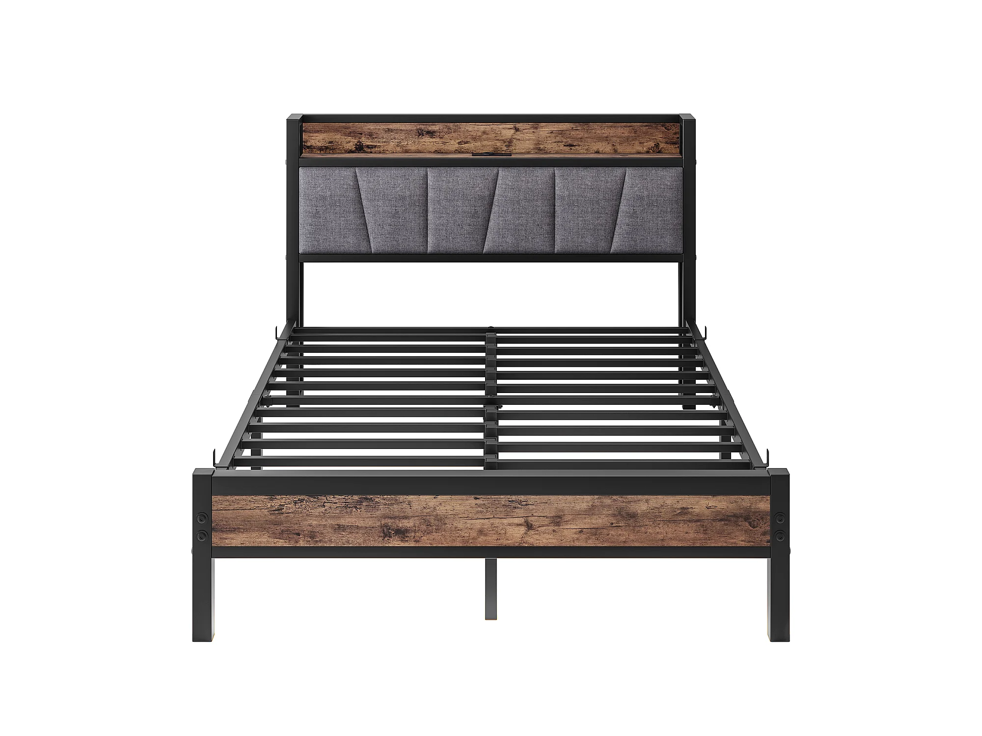 Lit adulte 140x190cm avec LED et USB - Cadre de lit avec sommier à lattes métallique - Noir et bois