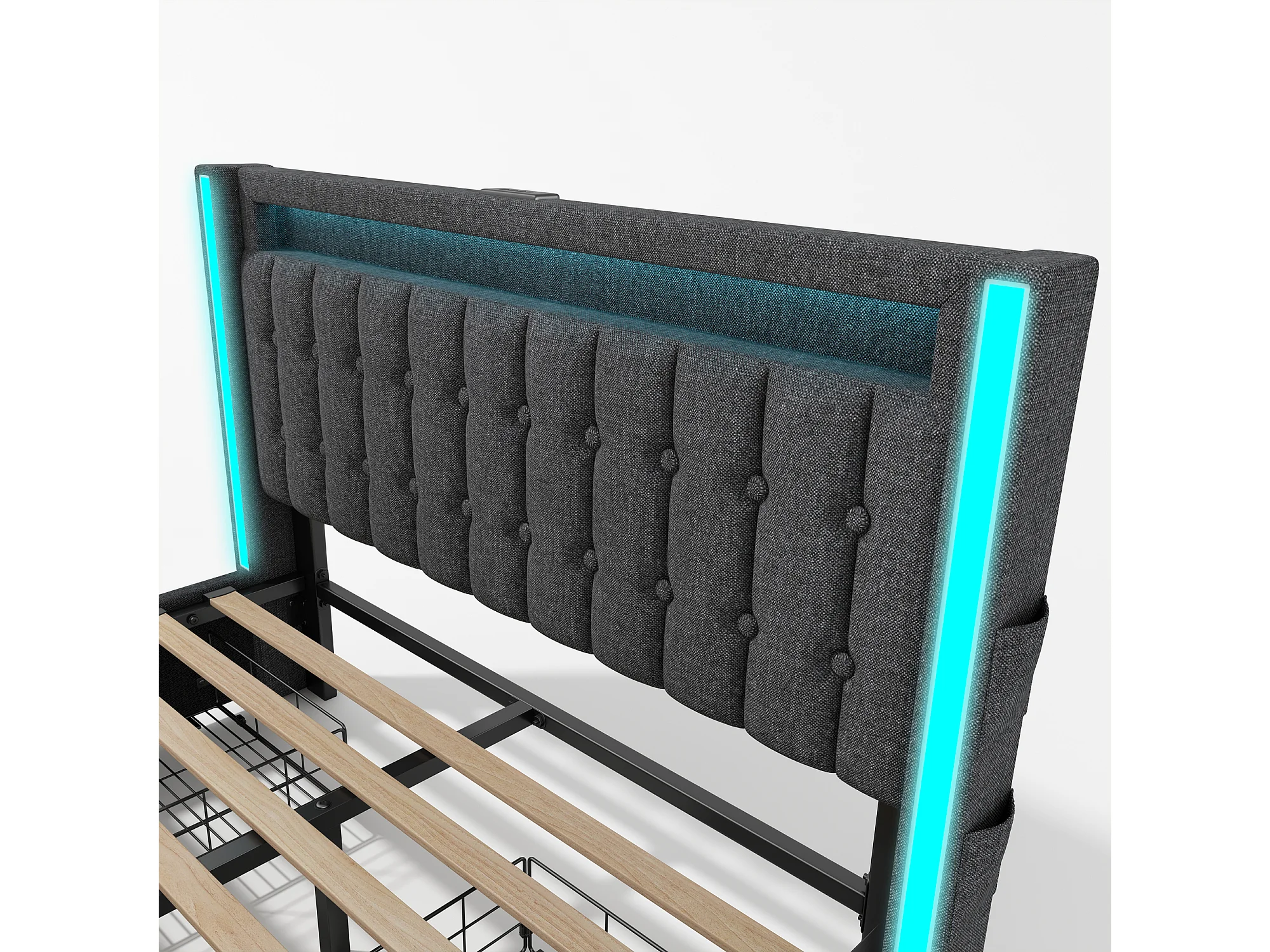Lit adulte 140x200 cm - avec tête de lit avec rangement, USB/Type-C, LED, 4 tiroirs - lin gris - matelas inclus
