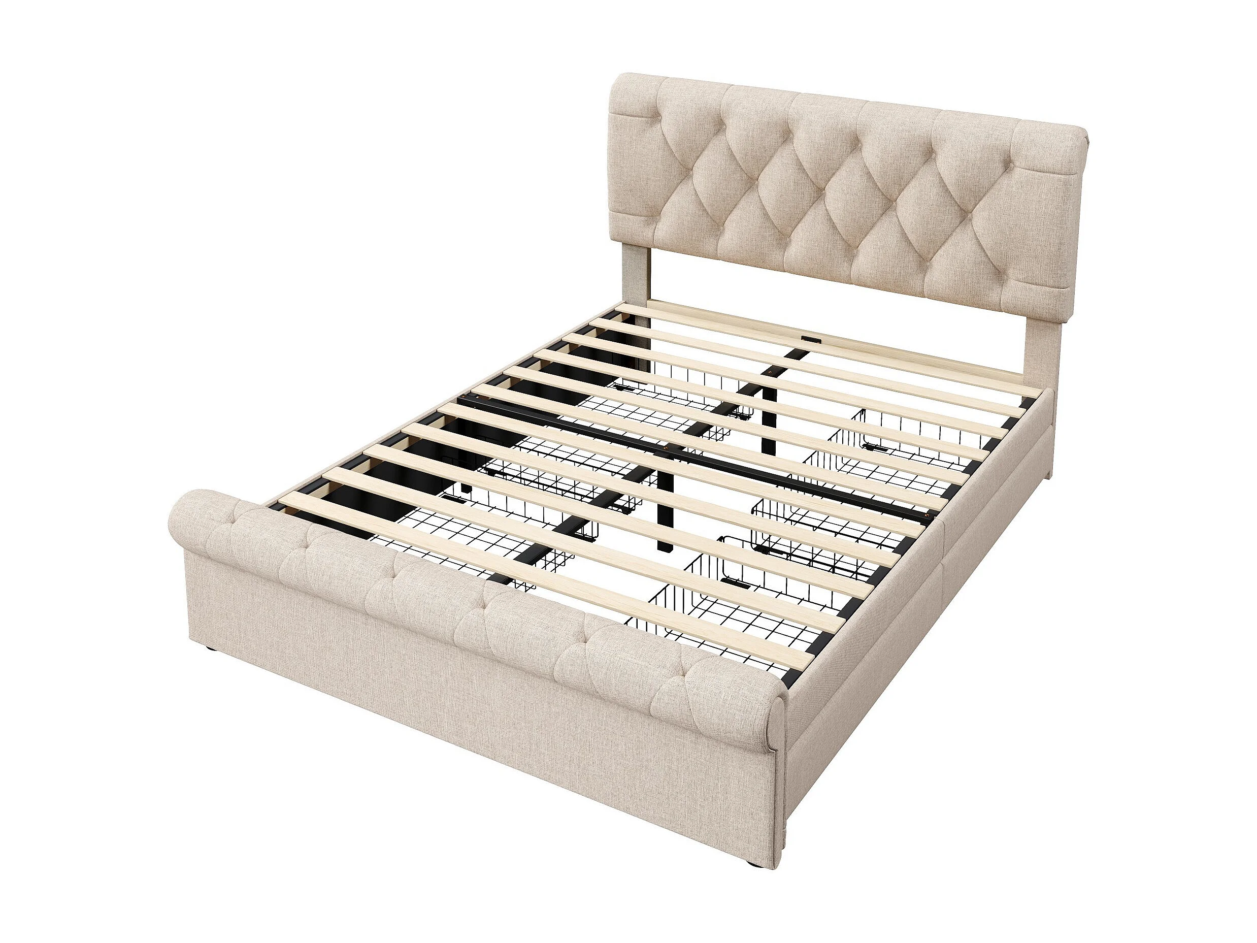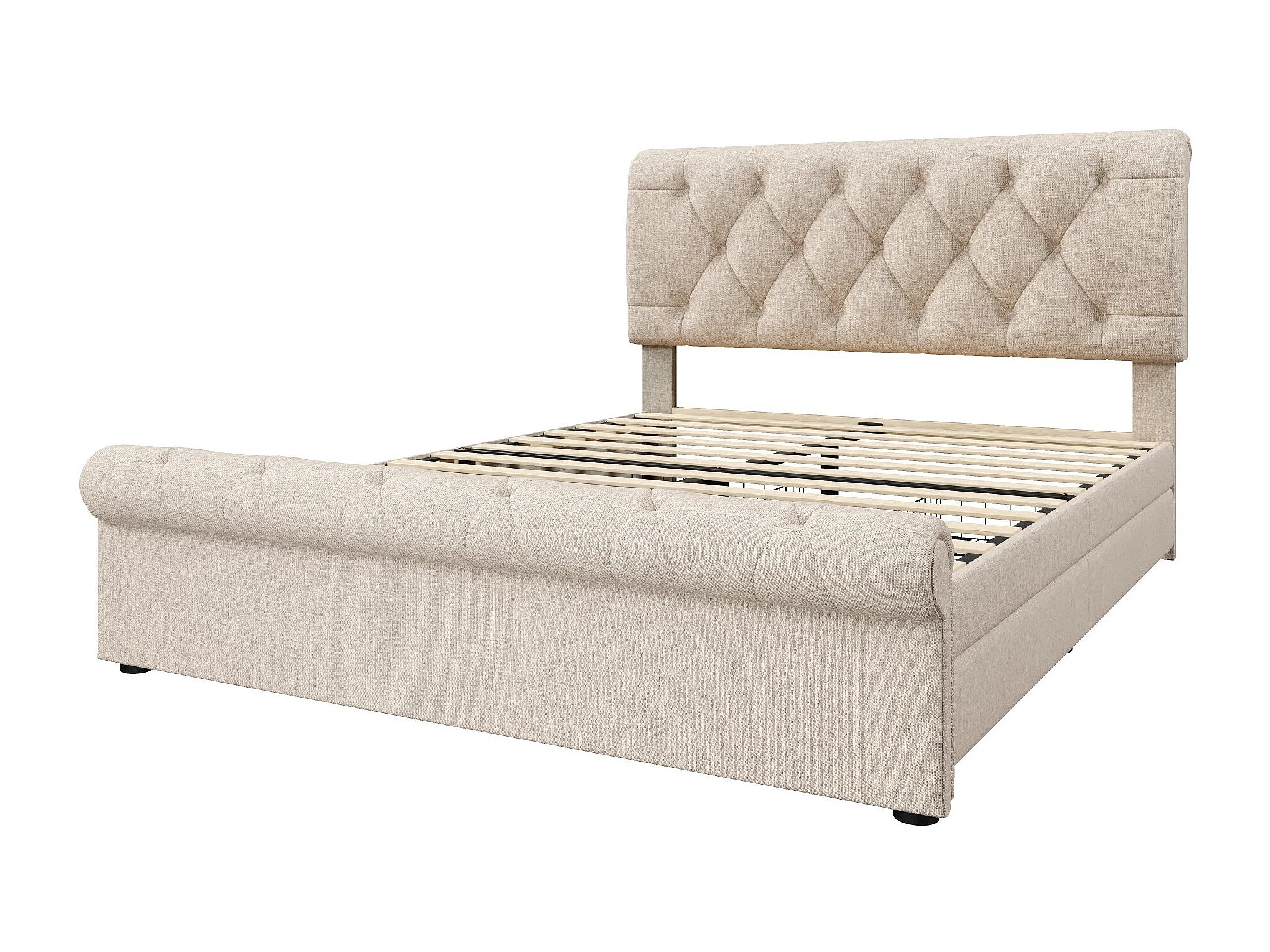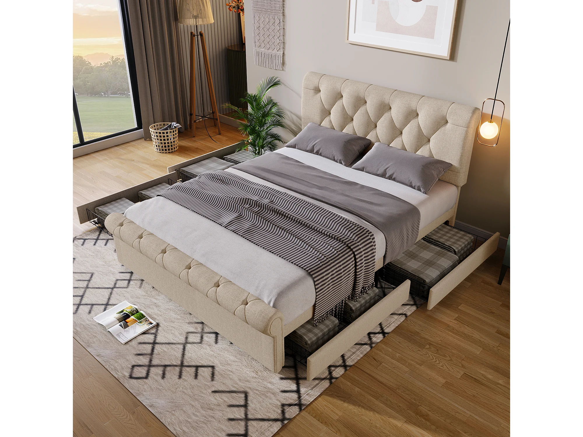 Lit adulte 140x200 cm - Lit double avec tête de lit réglable et 4 tiroirs de rangement - lin - naturel - sans matelas