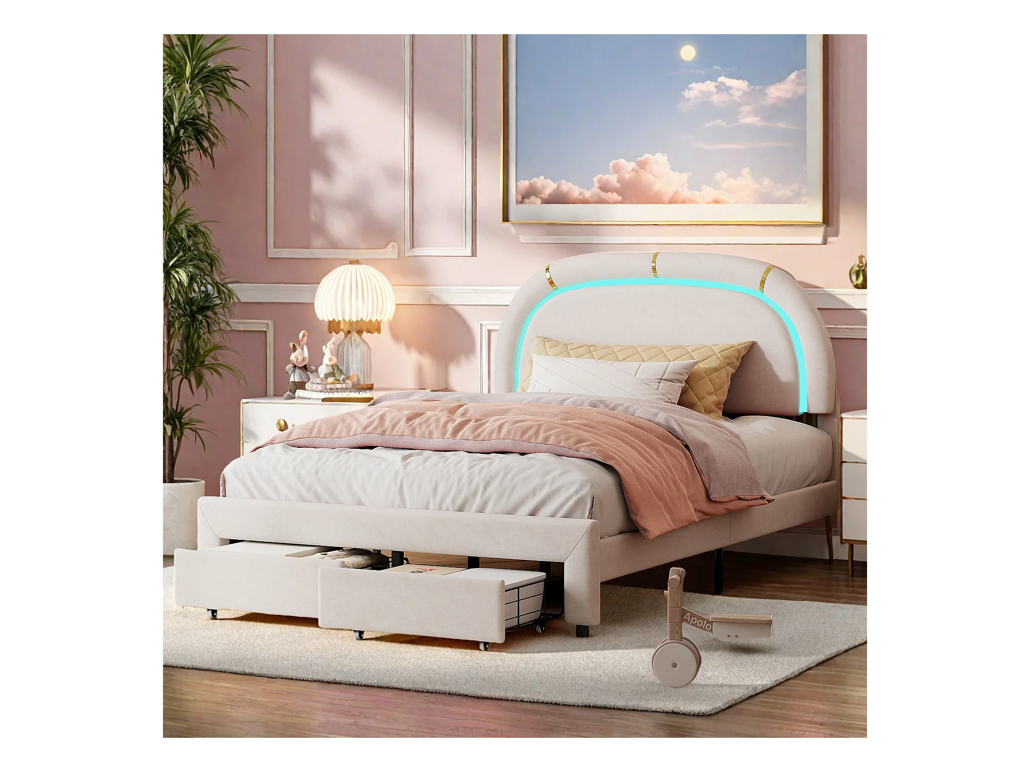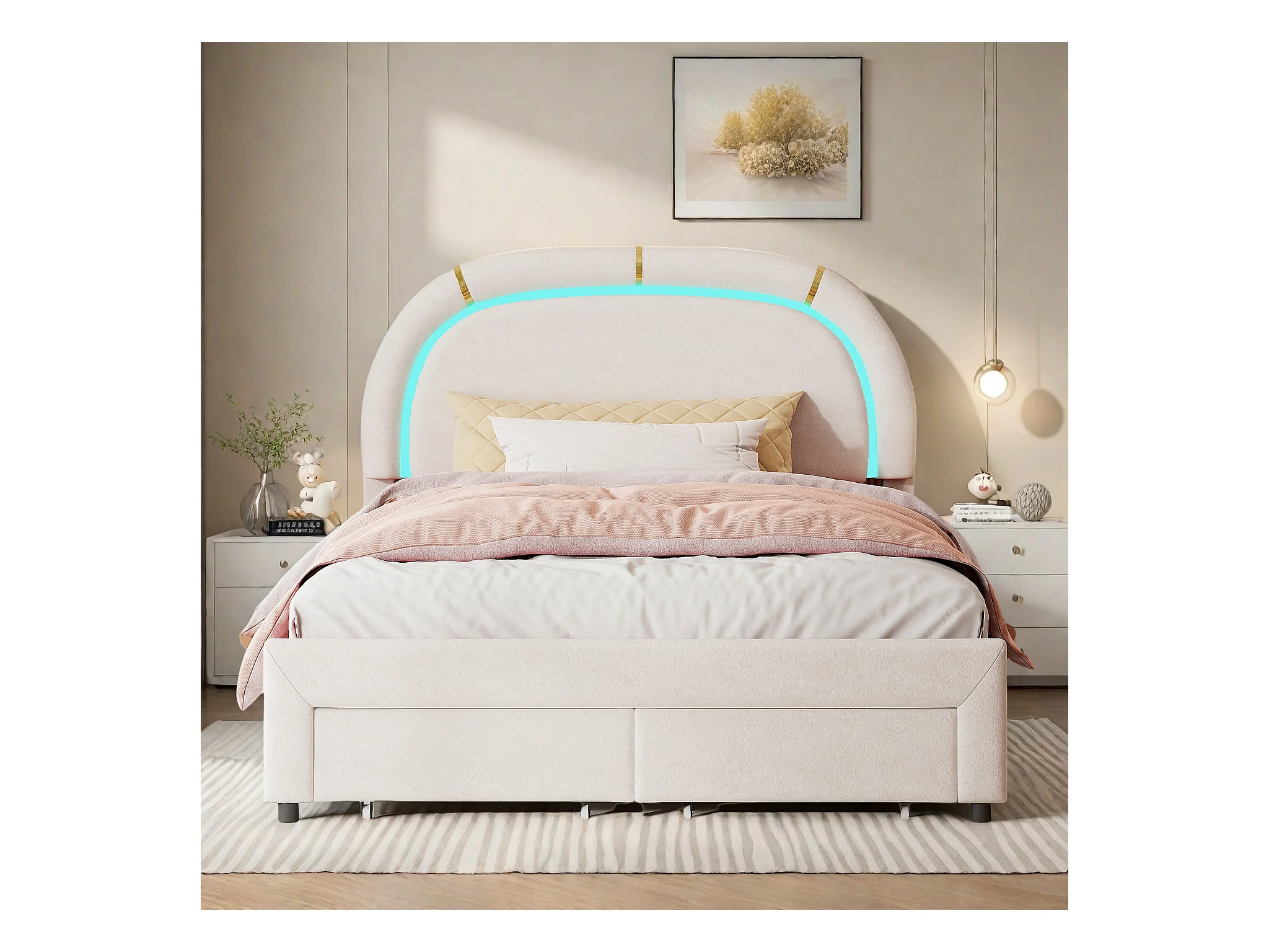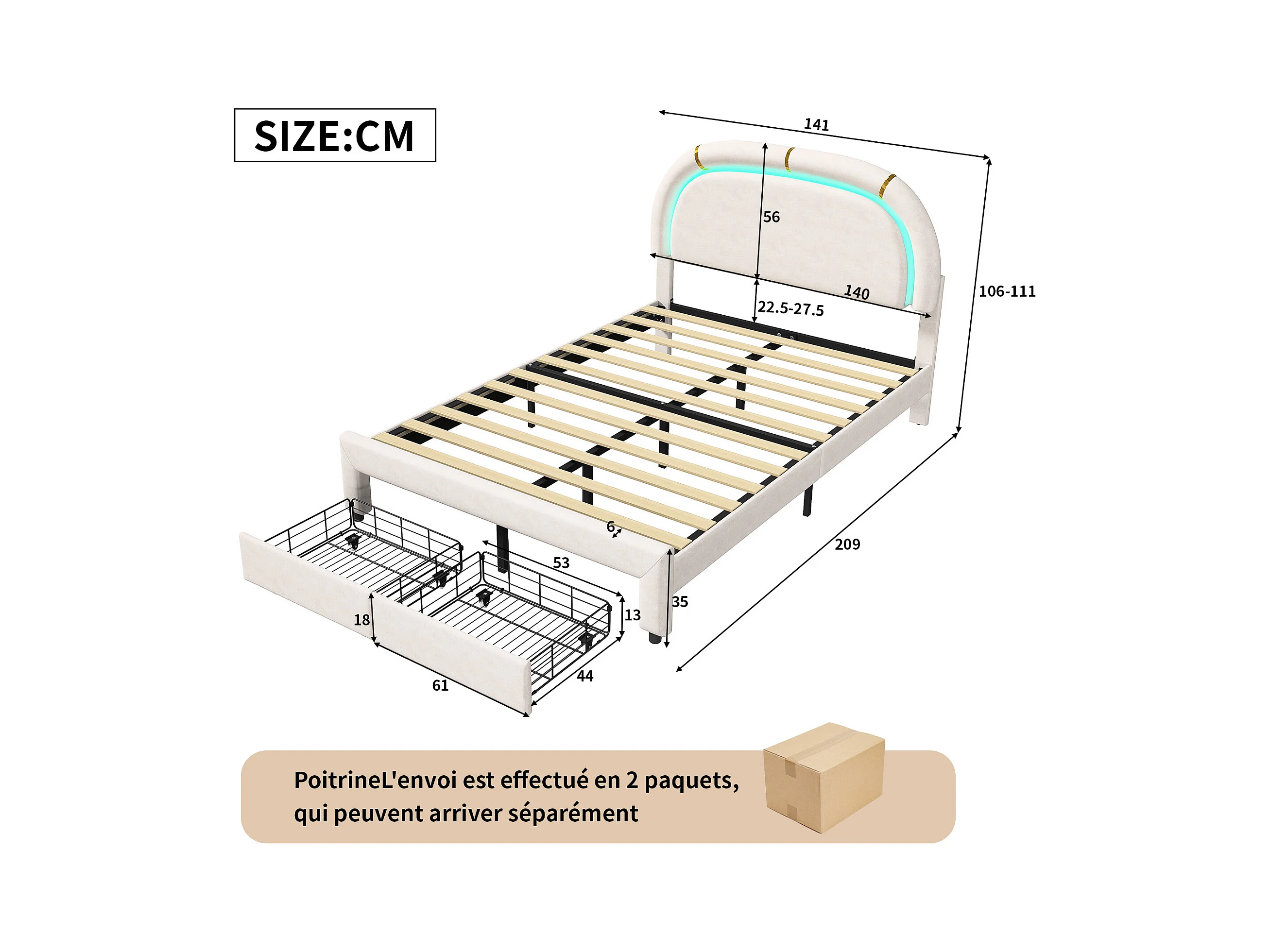 Lit Adulte 140x200 cm, Tête de lit rembourrée avec lumineuse LED, 2 Tiroirs, Velours, cadre de lit 140x200 cm, Beige