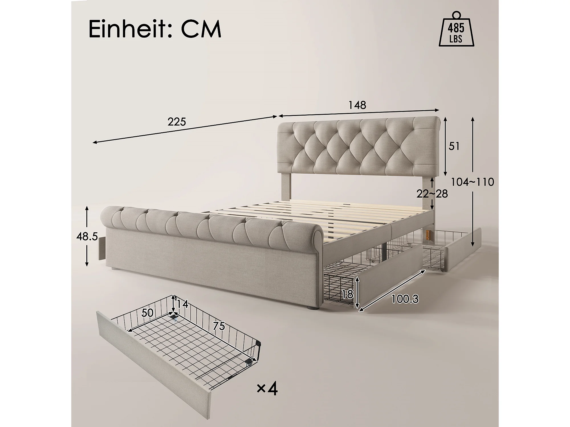 Lit adulte 140x200cm avec 4 tiroirs et tête de lit réglable, lin, beige, sans matelas