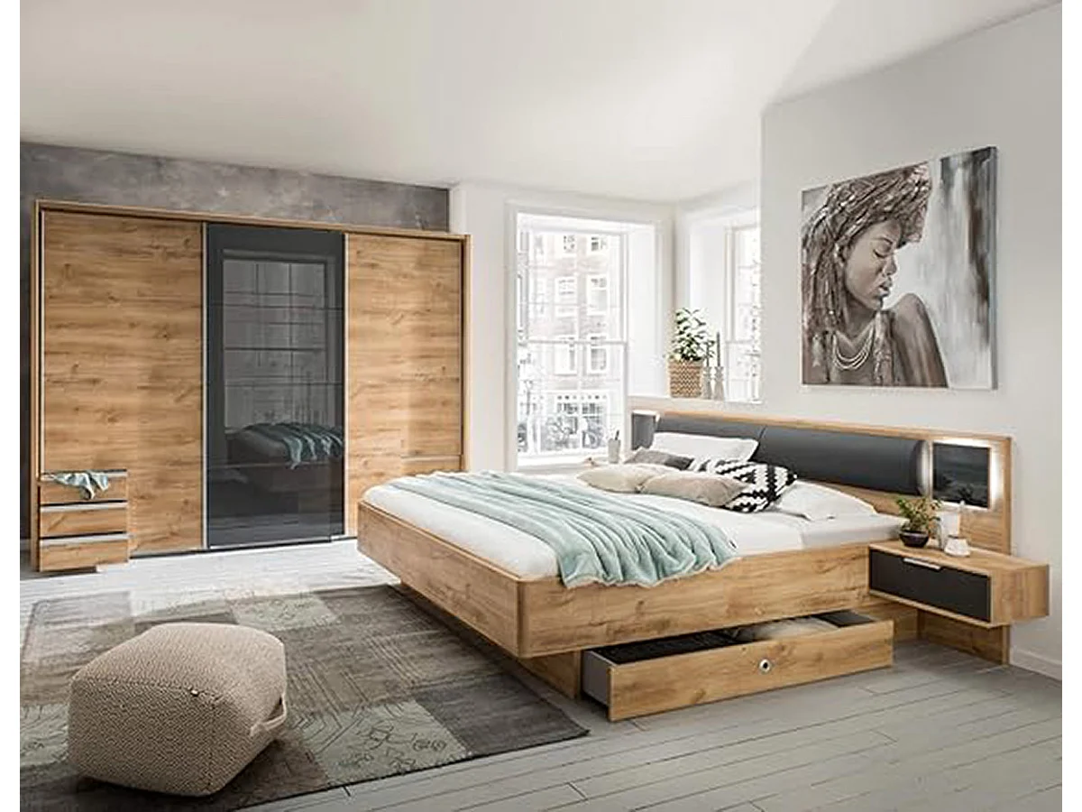 Lit adulte 160x200 avec 2 tables de chevet coloris imitation chêne poutre/graphite