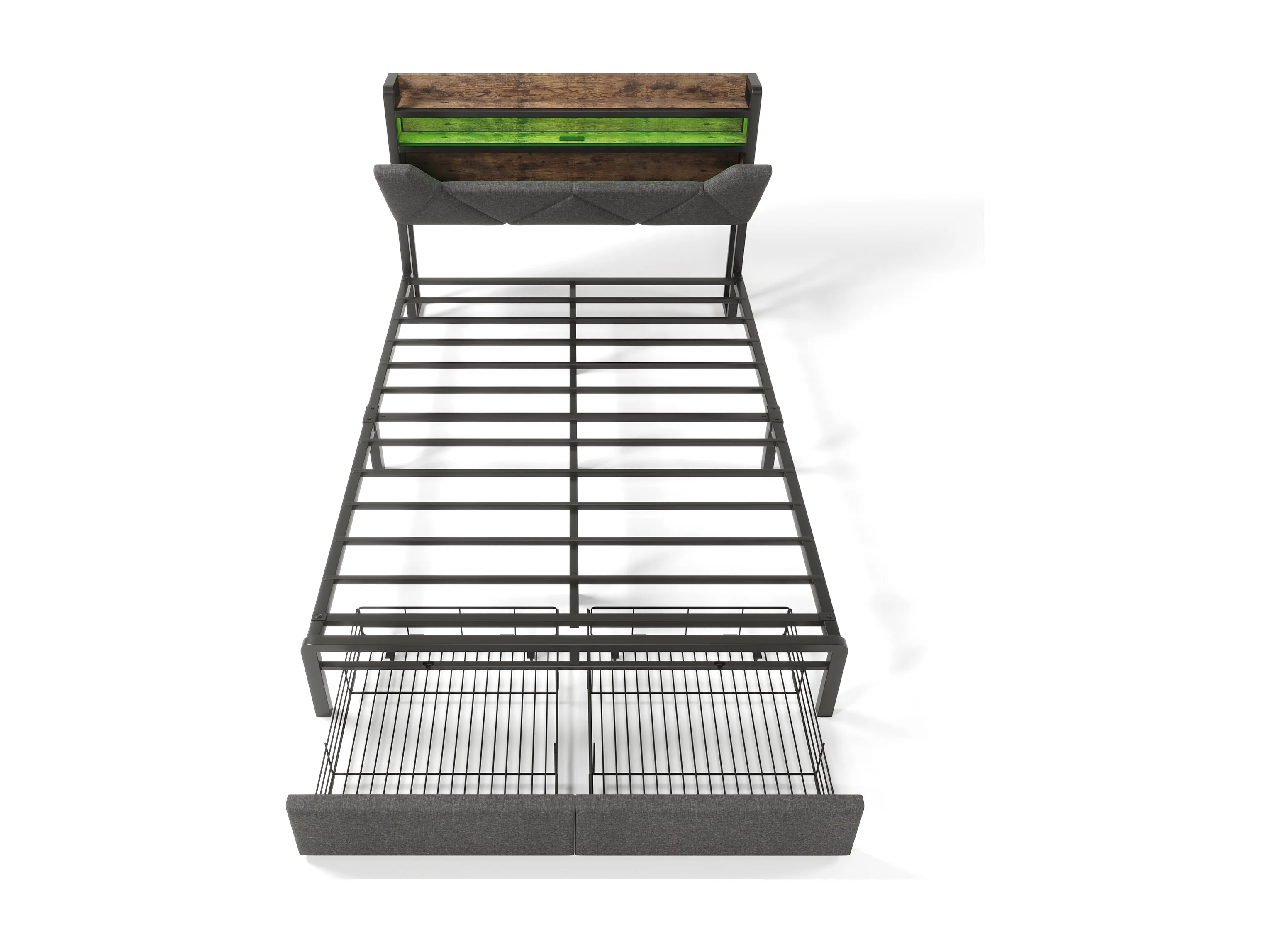 Lit adulte 160x200 avec tête de lit avec rangement, USB/Type-C, éclairage LED, 2 tiroirs, sommier à lattes - lin gris - sans matelas