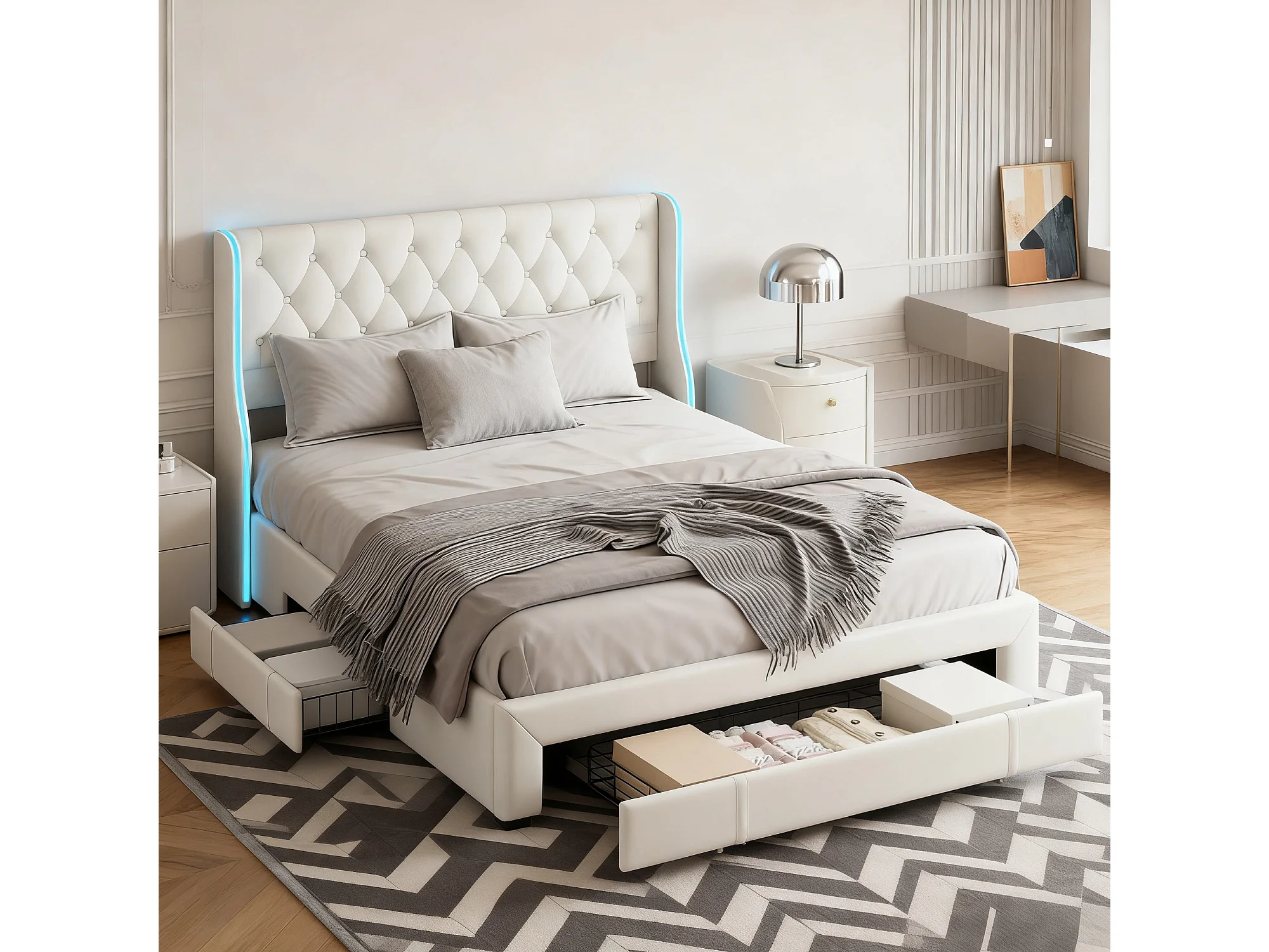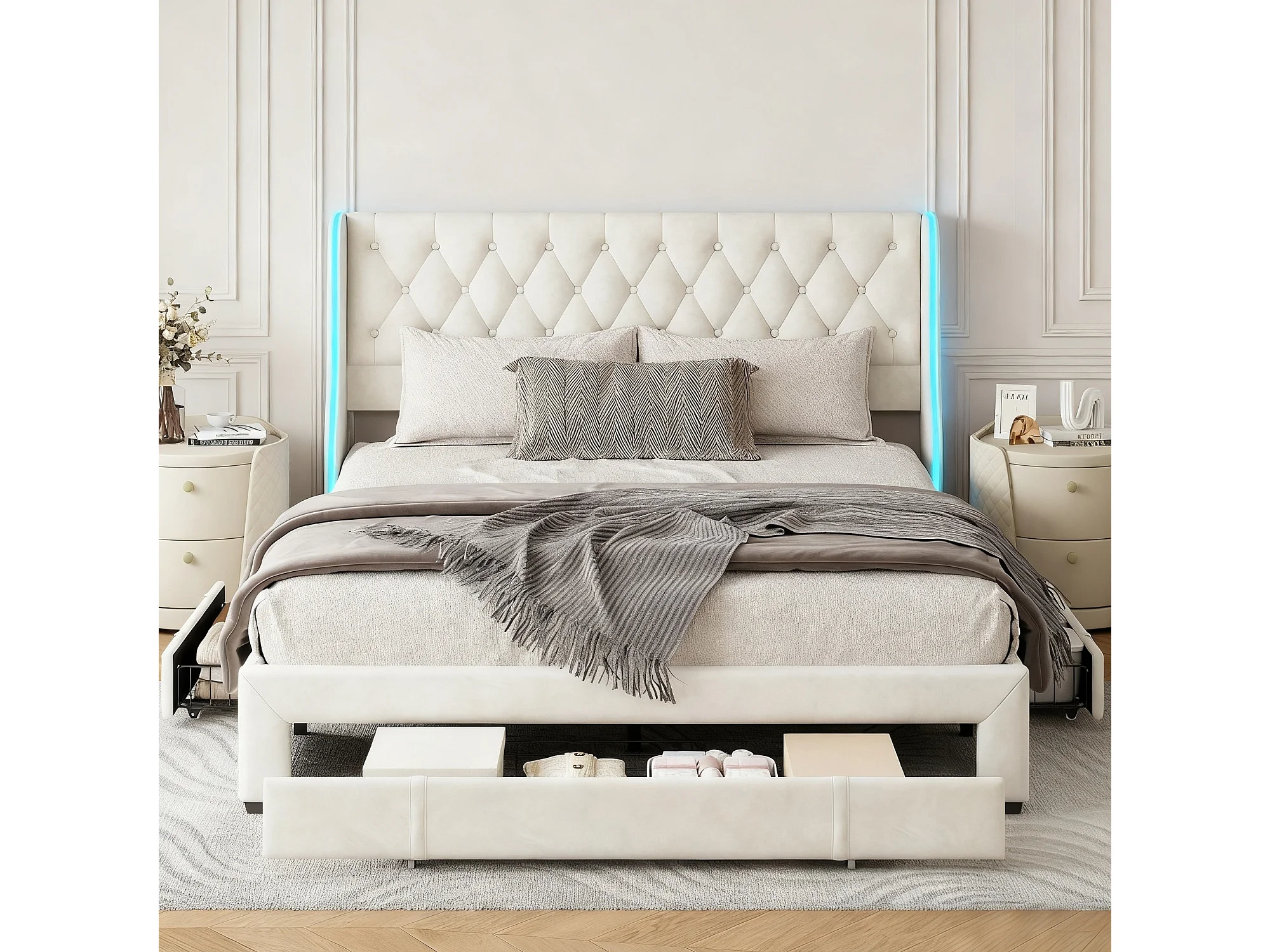 Lit adulte 160x200 cm avec 3 tiroir - cadre de lit double 160x200 cm avec sommier à lattes - lit 160x200 cm avec LED et boutons - tissu en velours - beige