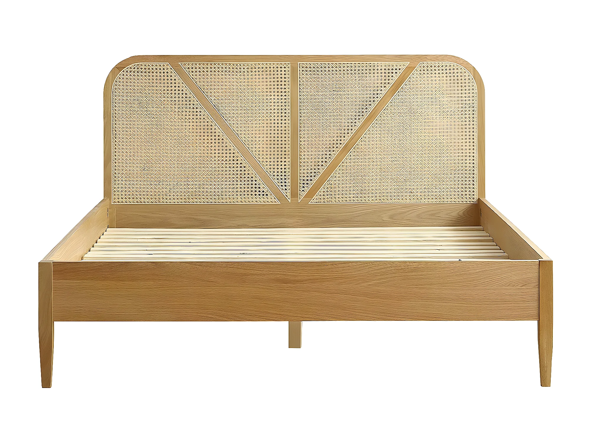Lit adulte 160x200 cm en placage chêne avec tête de lit en bois massif et cannage naturel - Leonie