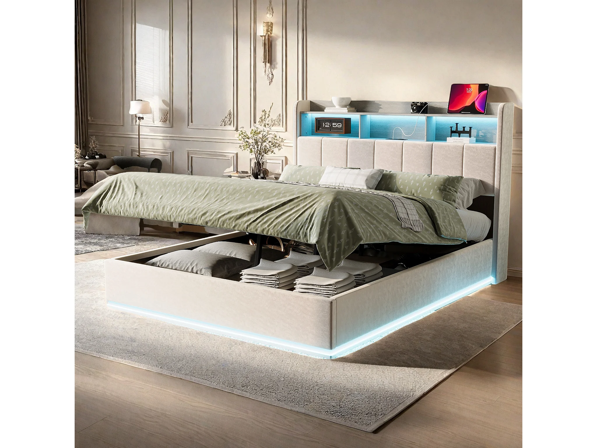 Lit adulte 160x200 cm, Lit 160x200 cm avec espace de rangement, USB et Type C, LED, Lit coffre 160x200cm, Tissu en velours, Blanc