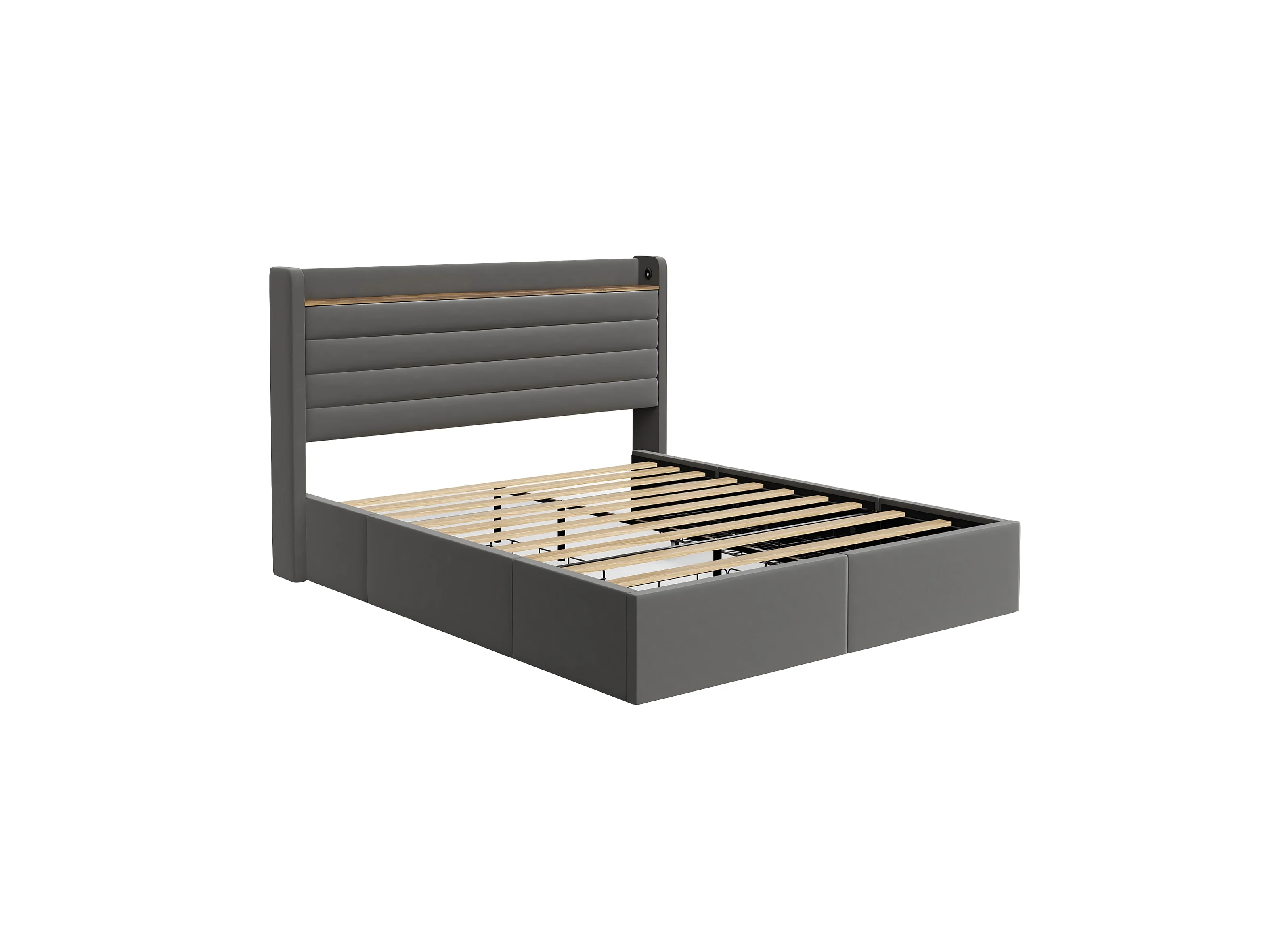 Lit adulte 160x200 cm, lit double avec port USB et 4 tiroirs de rangement - velours gris (sans matelas)