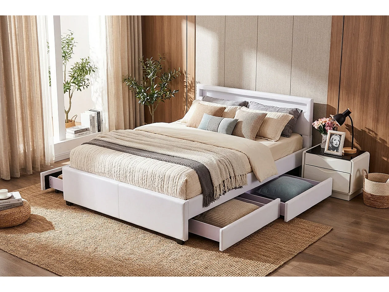 Lit adulte 160x200 cm blanc avec tiroirs LED sommier inclus