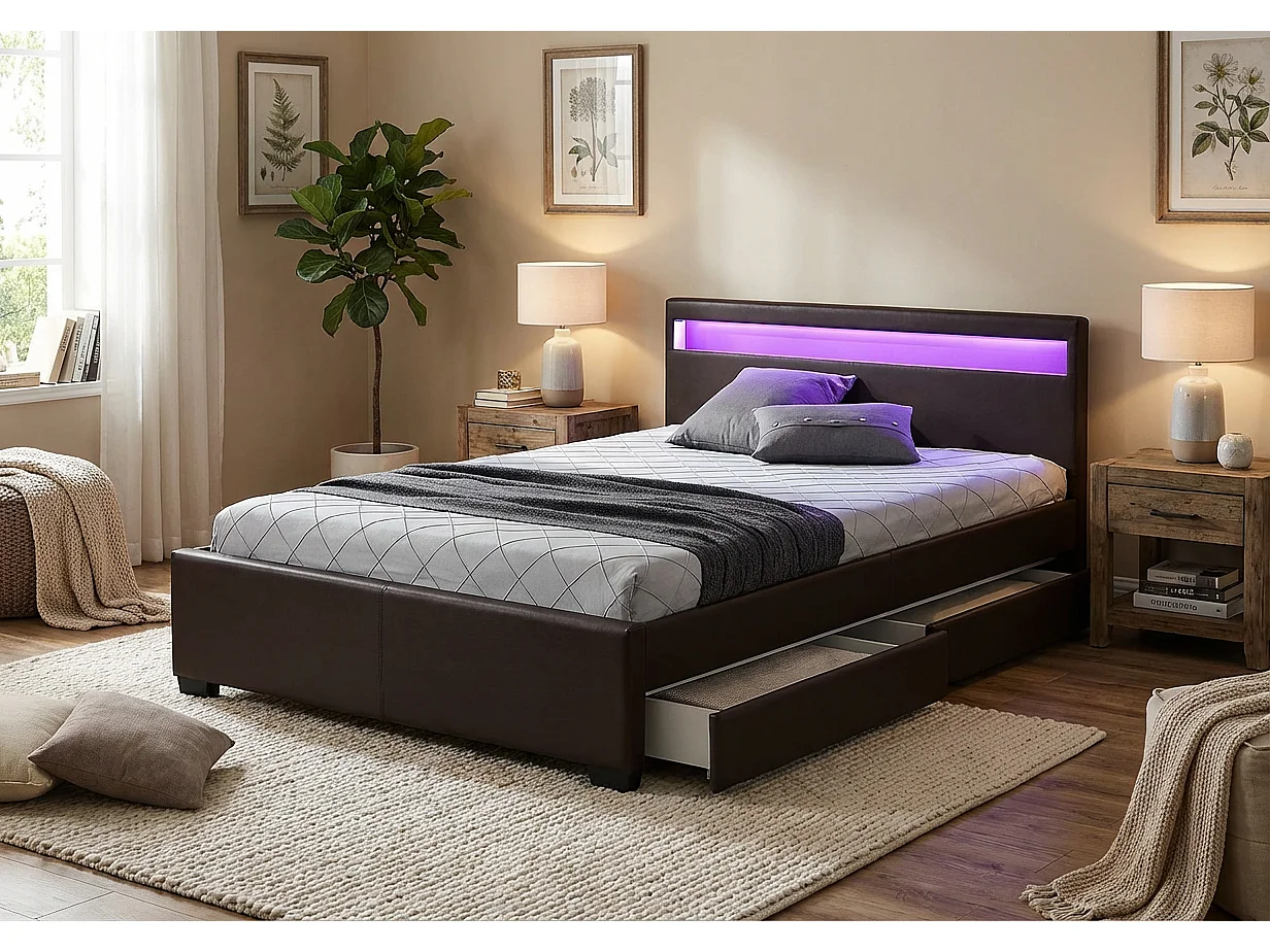 Lit adulte 160x200 cm noir avec tiroirs LED sommier inclus