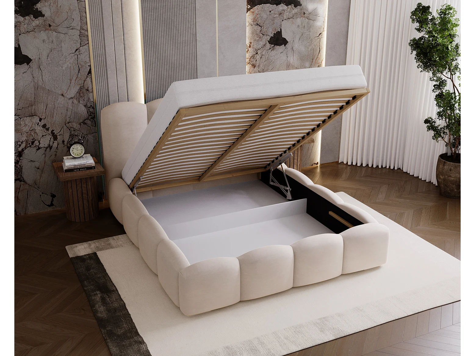Lit adulte 160x200 Zenna - coffre de rangement, sommier - velours, Beige (Magic Velvet 2201)