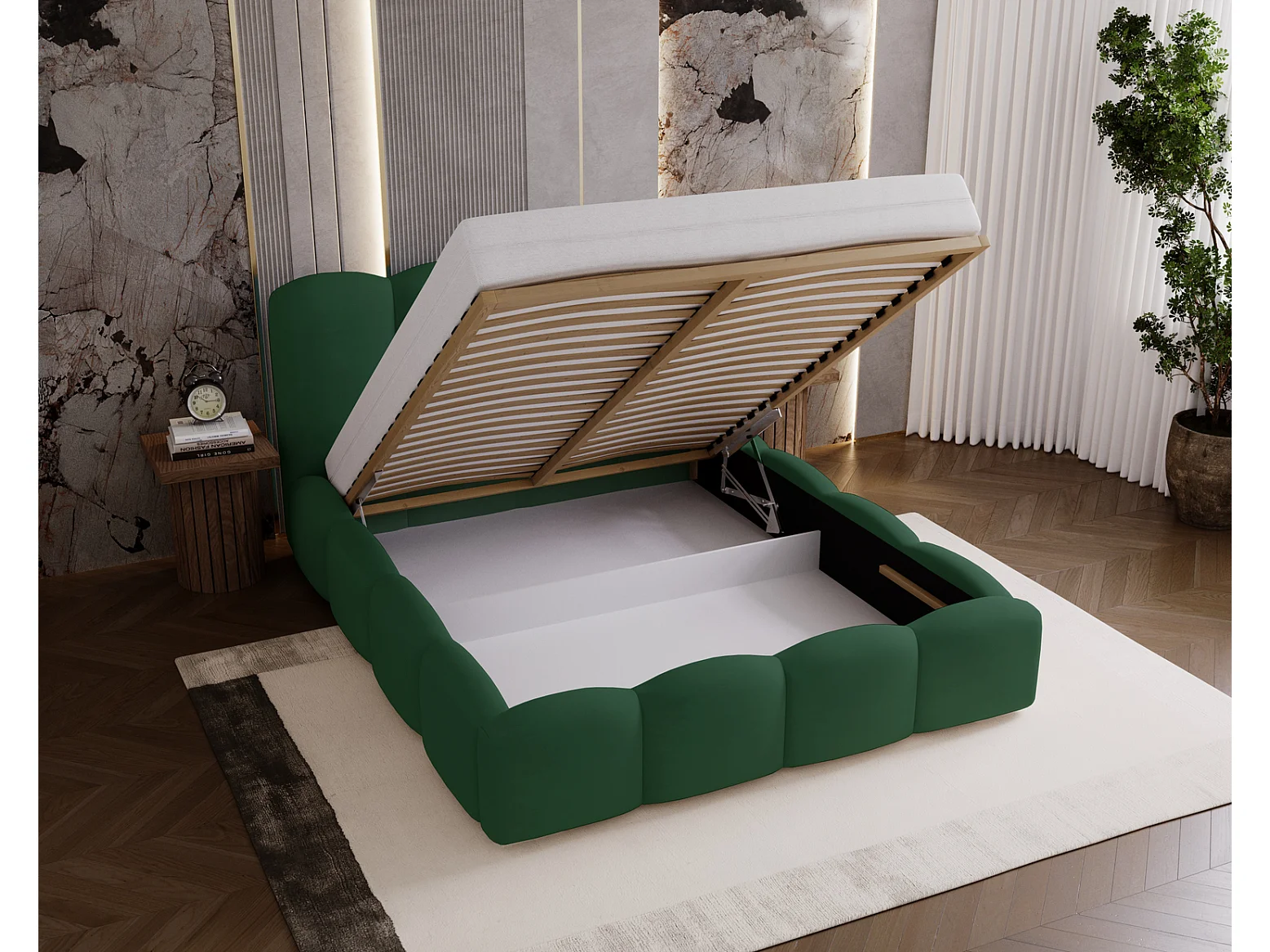Lit adulte 160x200 Zenna - coffre de rangement, sommier - velours, Vert (Magic Velvet 2225)