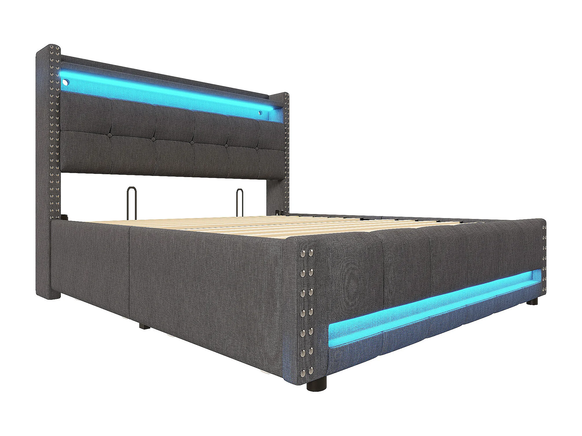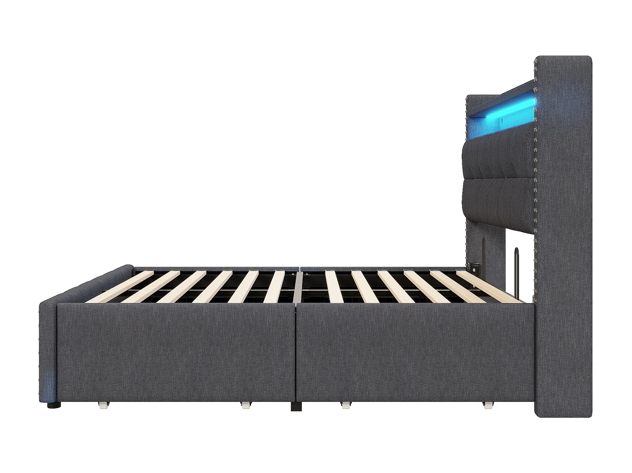 Lit adulte 160x200cm gris en lin avec 4 tiroirs, LED et USB, Sommier à lattes, sans matelas