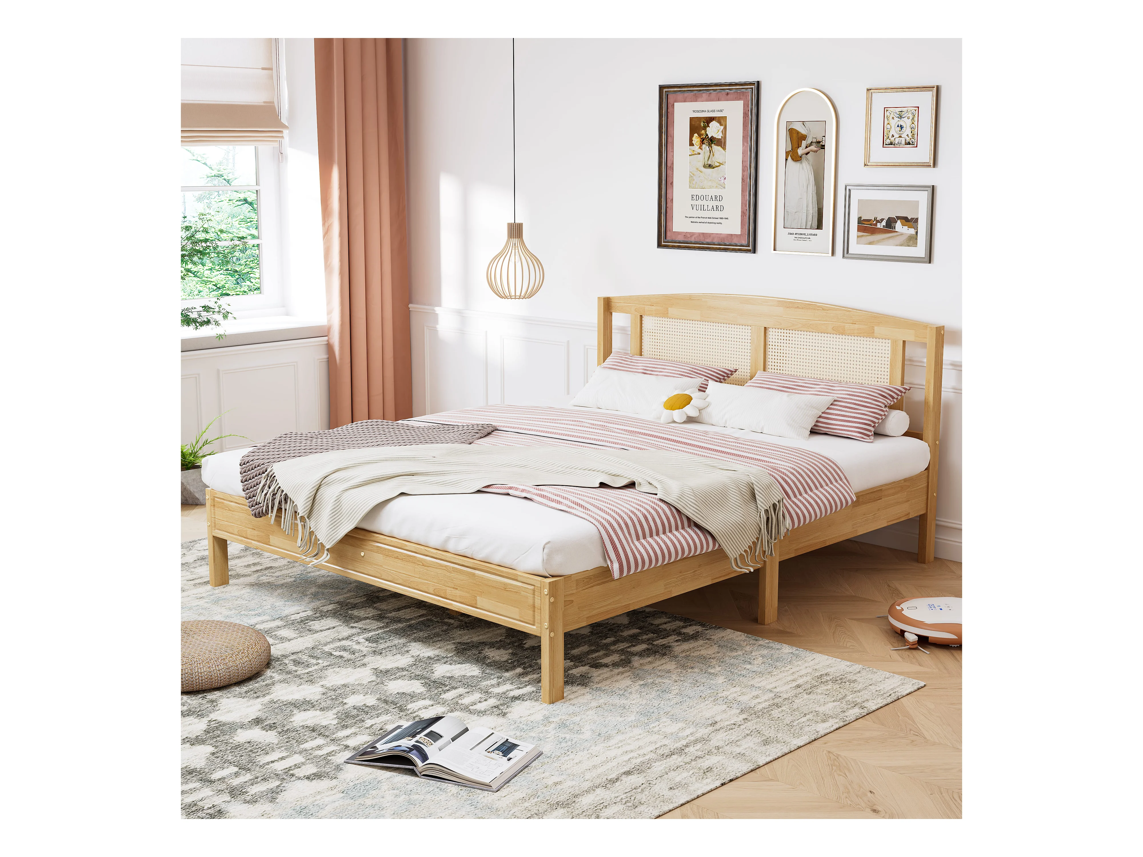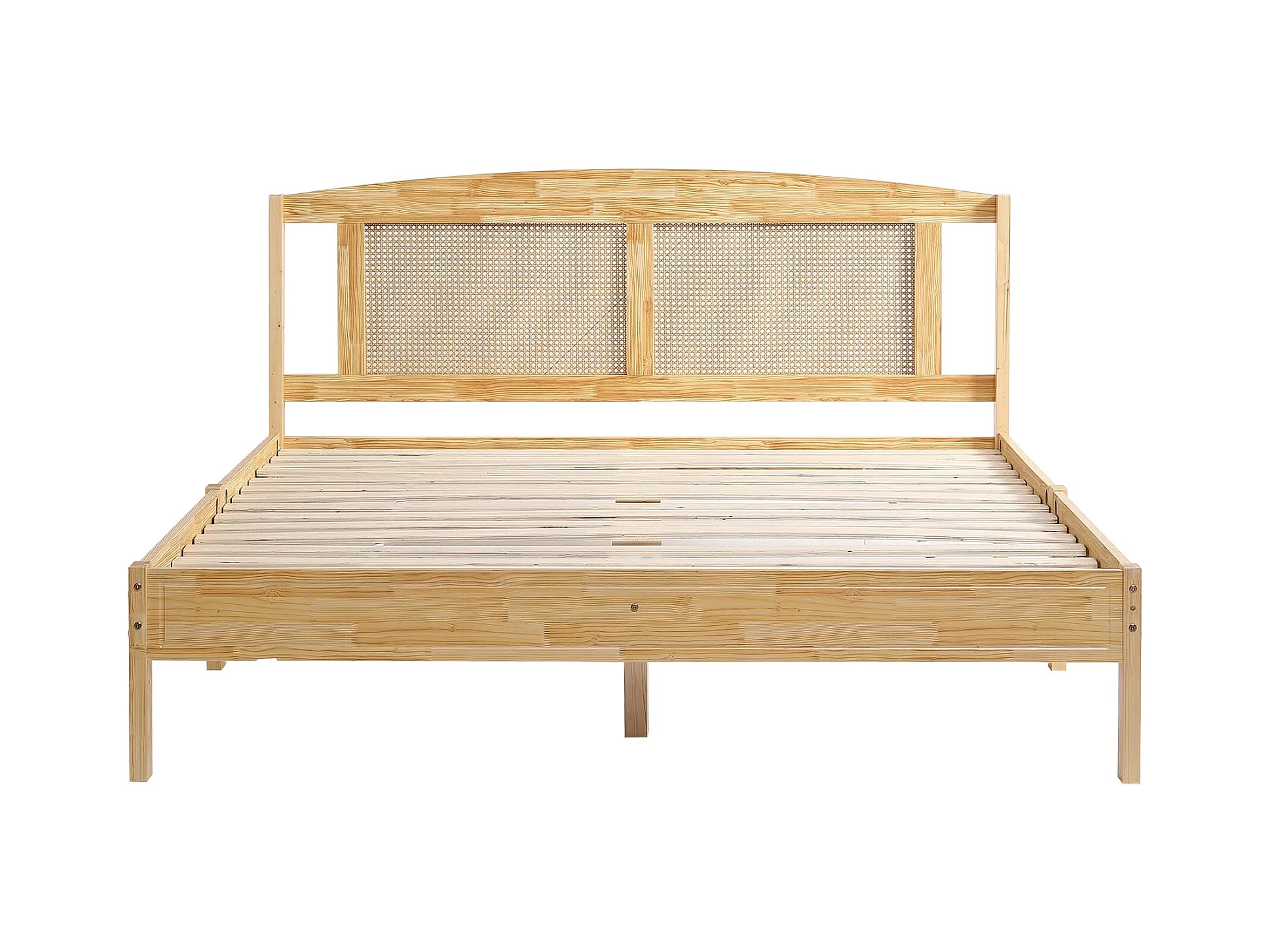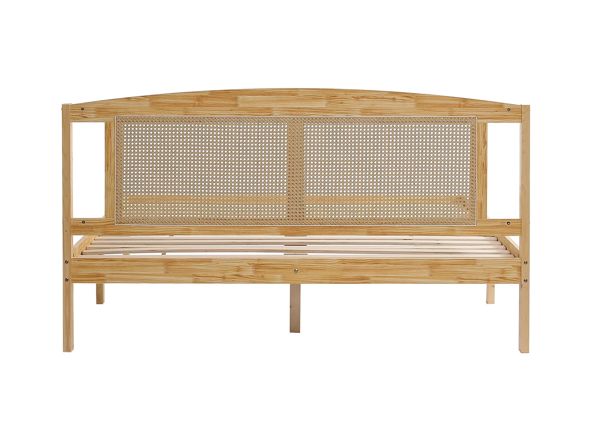 Lit adulte 160x200cm Lit double avec 15 lattes et pieds centraux pin + rotin PE Naturel