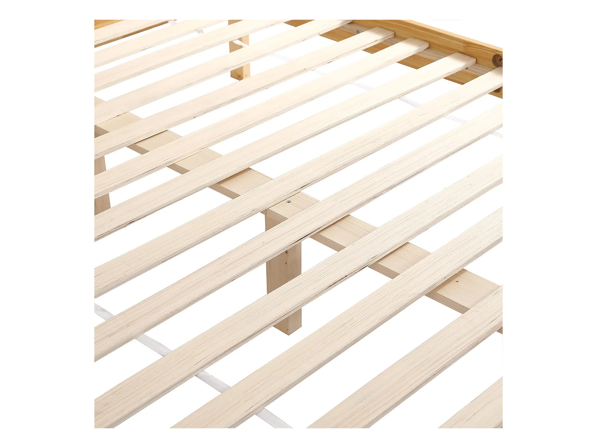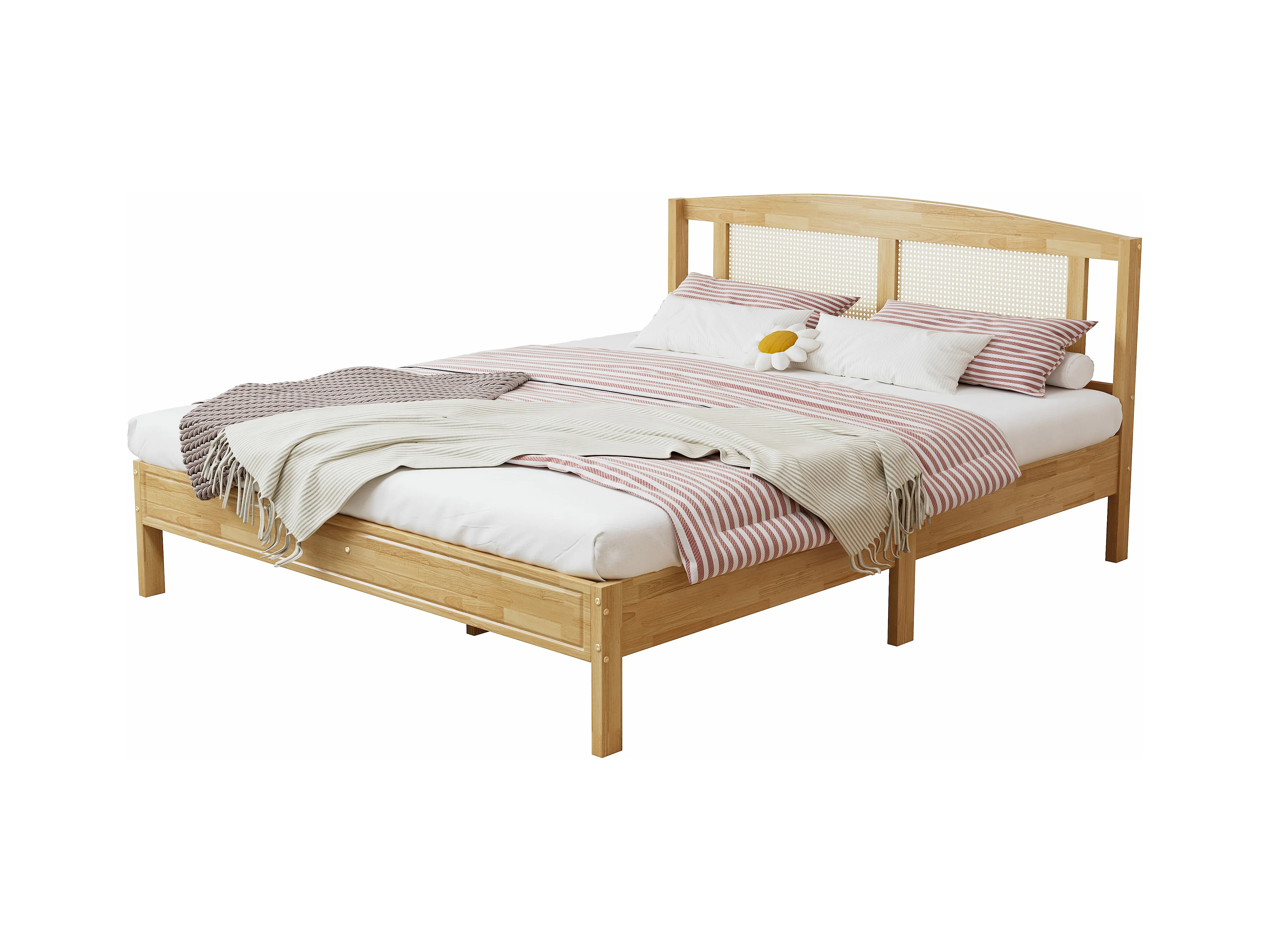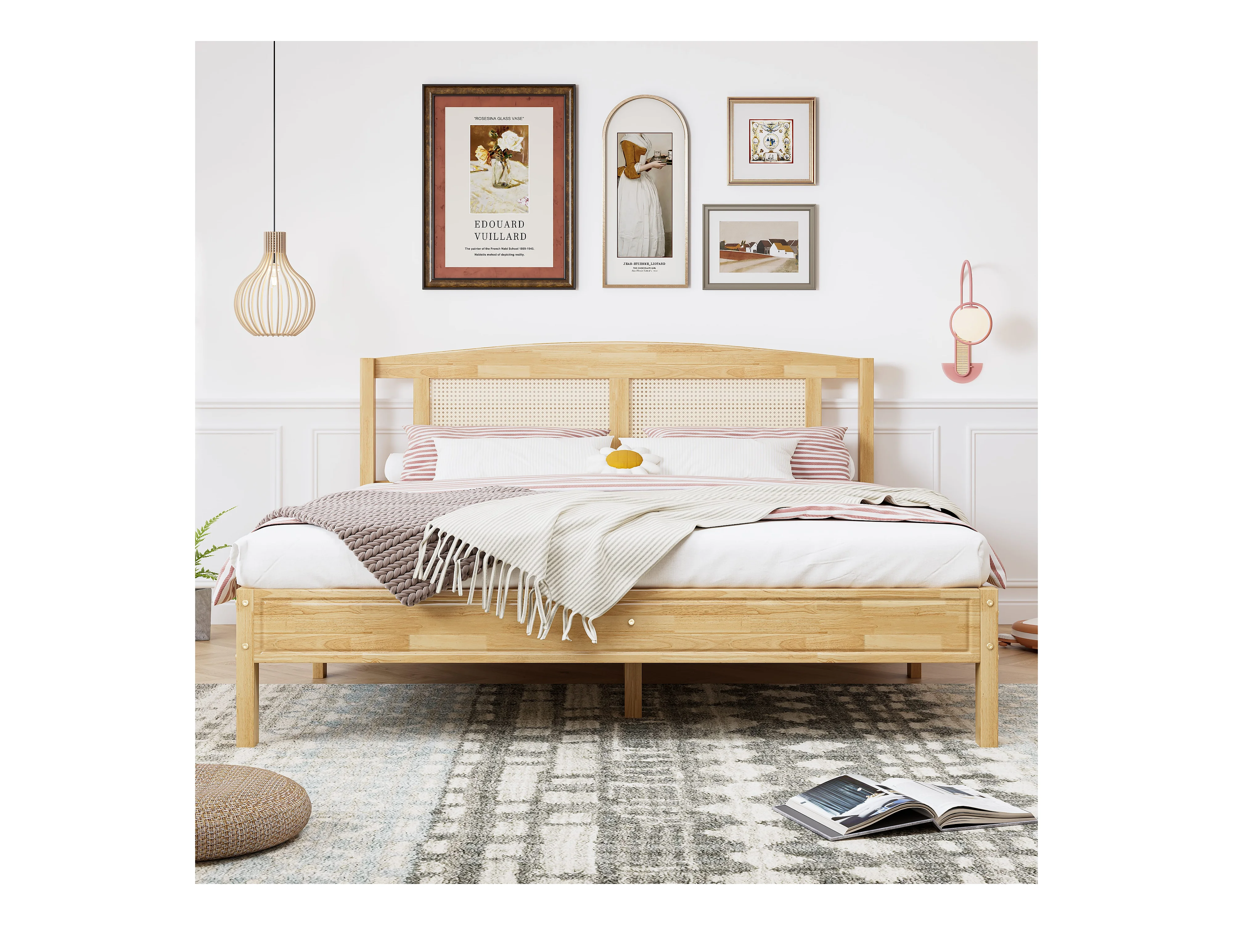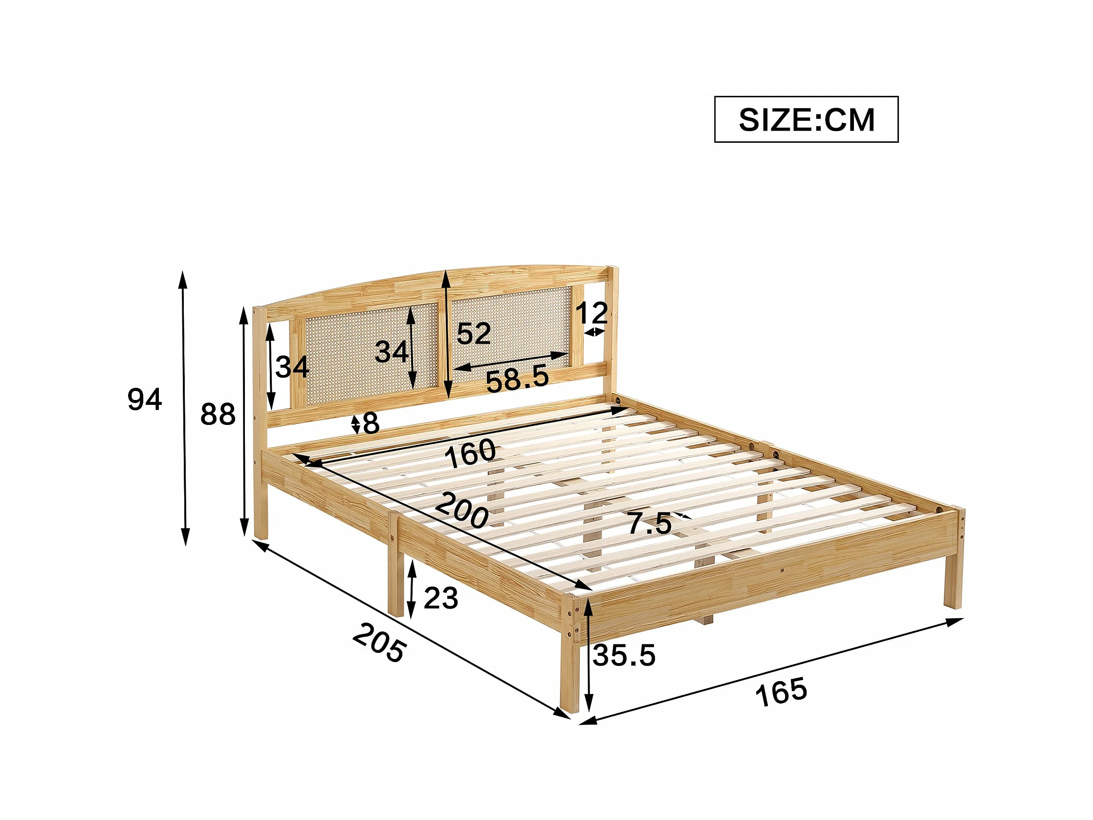 Lit adulte 160x200cm Lit double avec 15 lattes et pieds centraux pin + rotin PE Naturel