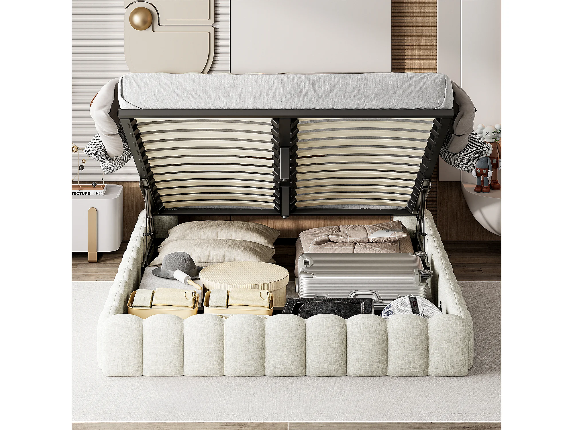Lit adulte 180x200 avec sommier tapissier – Rangement intégré – Matériau lin – Ports USB et LED réglables – Capacité 300 kg-Beige