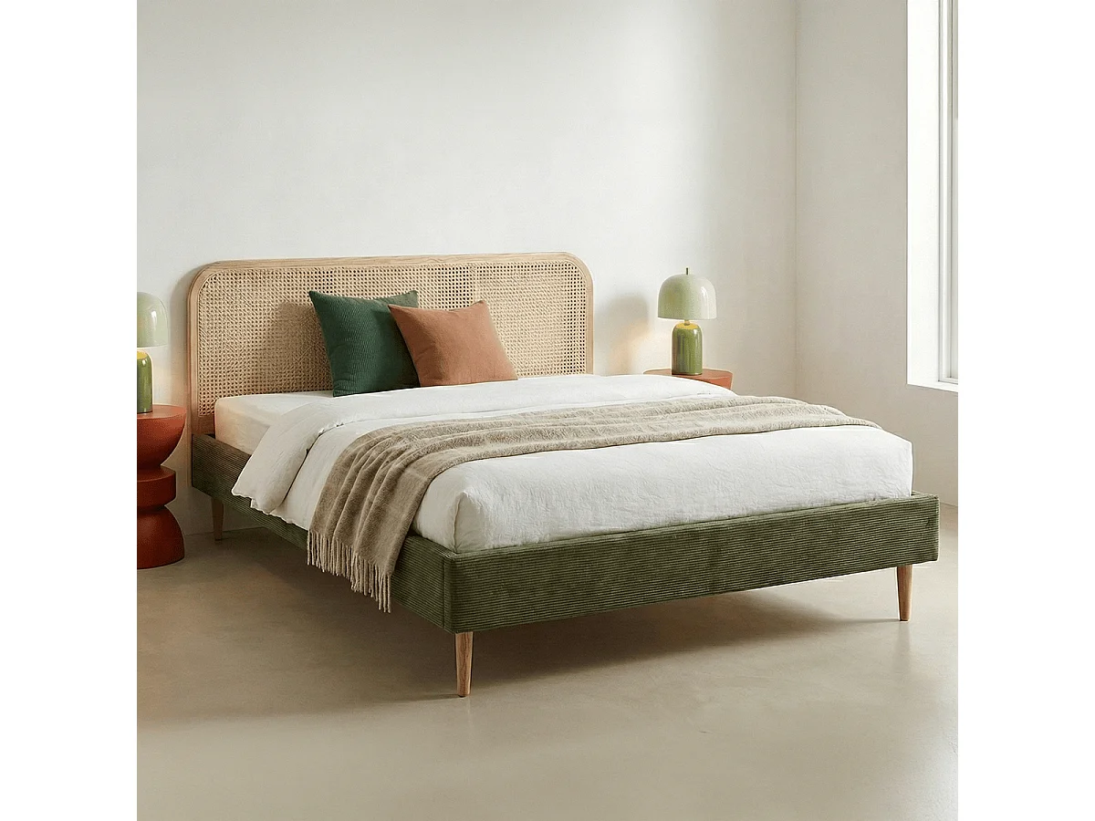 Lit adulte 180x200 cm en velours côtelé vert kaki avec tête de lit en cannage - Dalia