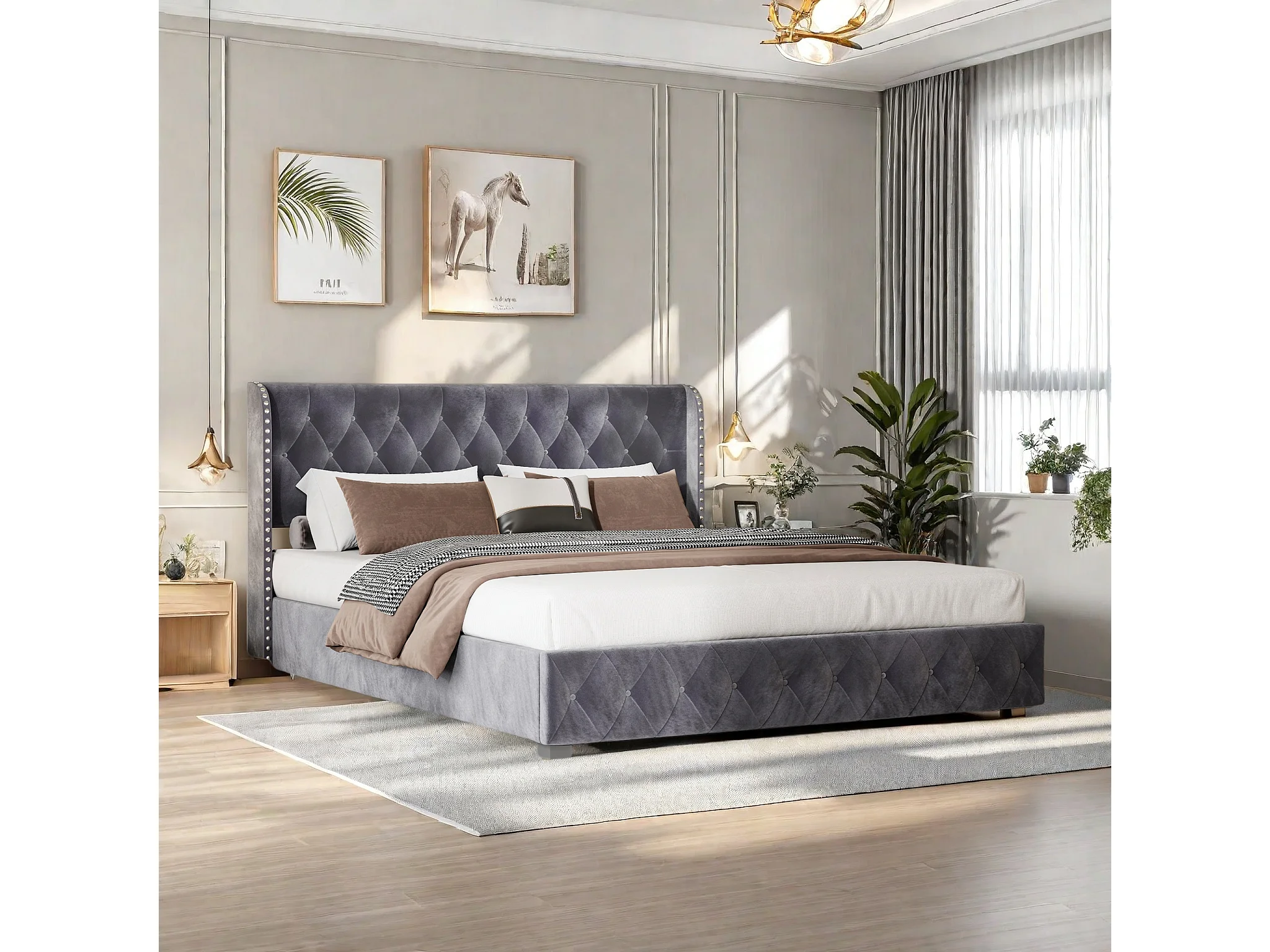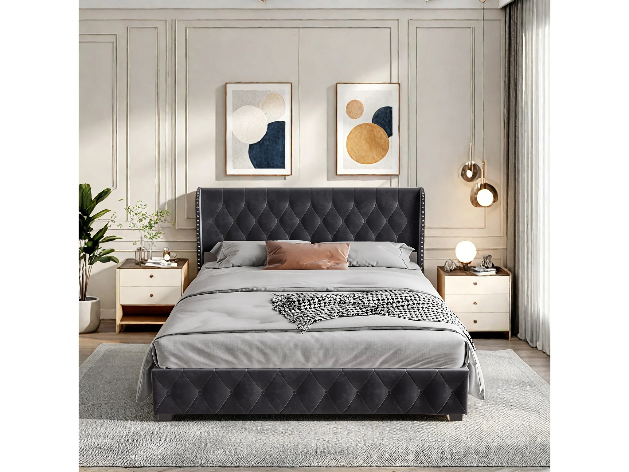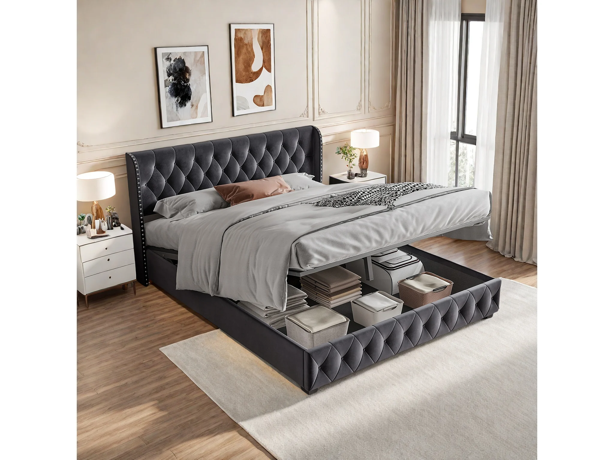 Lit Adulte 180x200 cm Tête de lit décorative bouton Lit Coffre sommier à lattes Lit fonctionnel hydraulique Velours Gris
