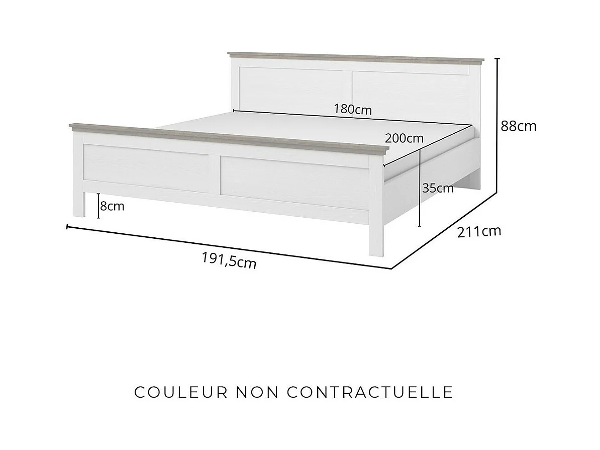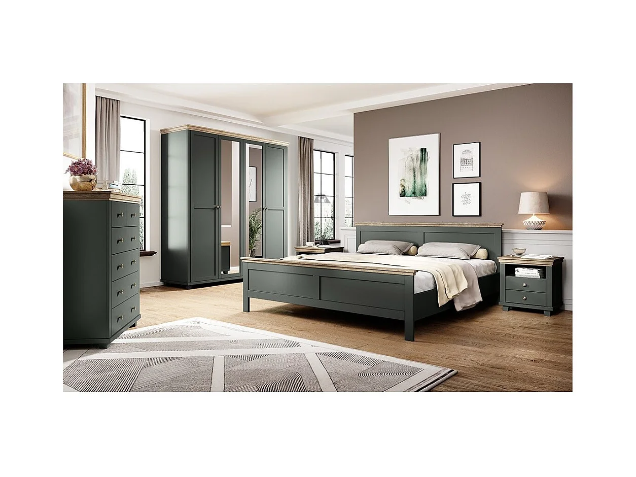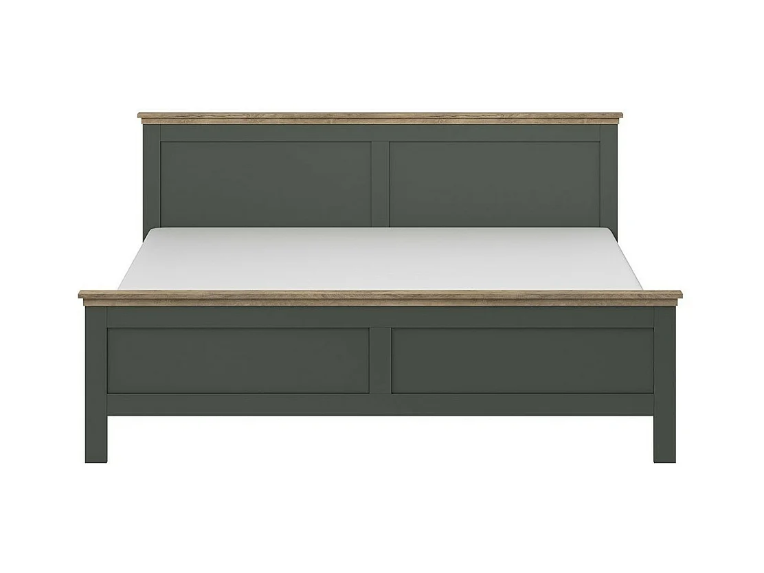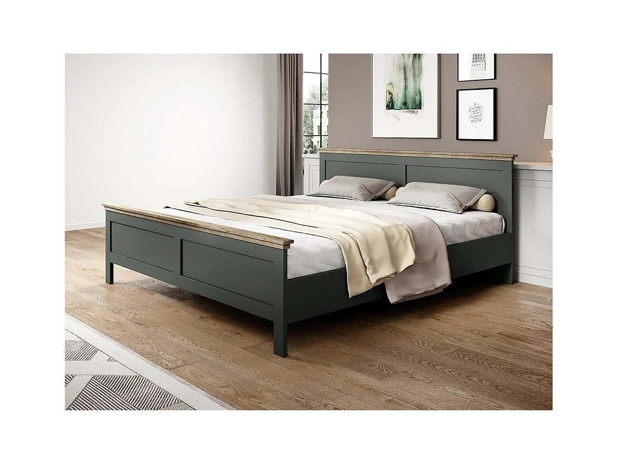 Lit adulte 180x200 collection ASSIA. Coloris vert kaki et finitions aspect chêne