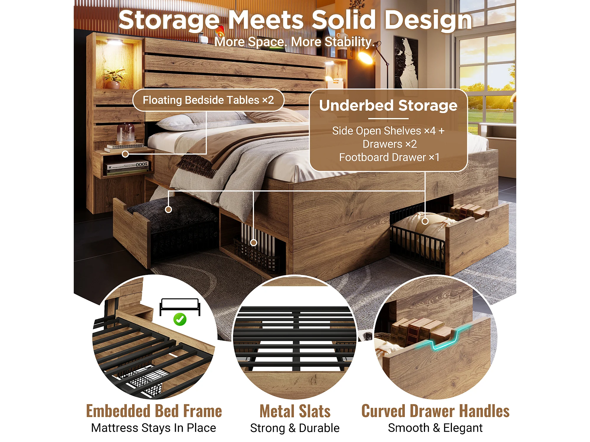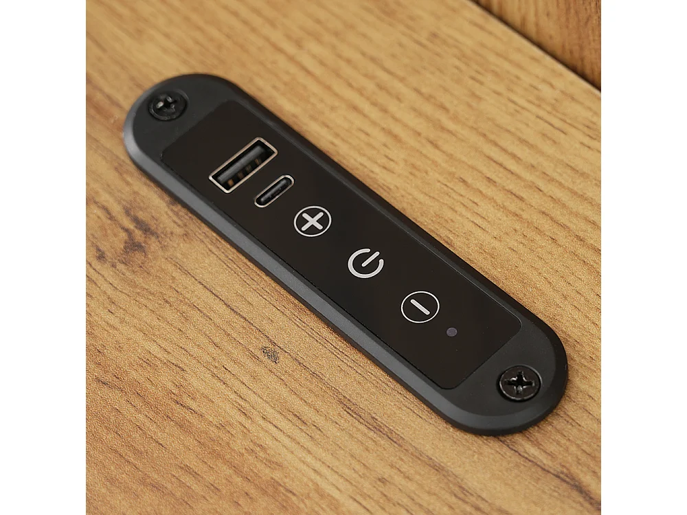 Lit adulte 180×200cm en bois + MDF - avec table de chevet suspendue - avec LED + prises chargement - avec espace de rangement - Naturel