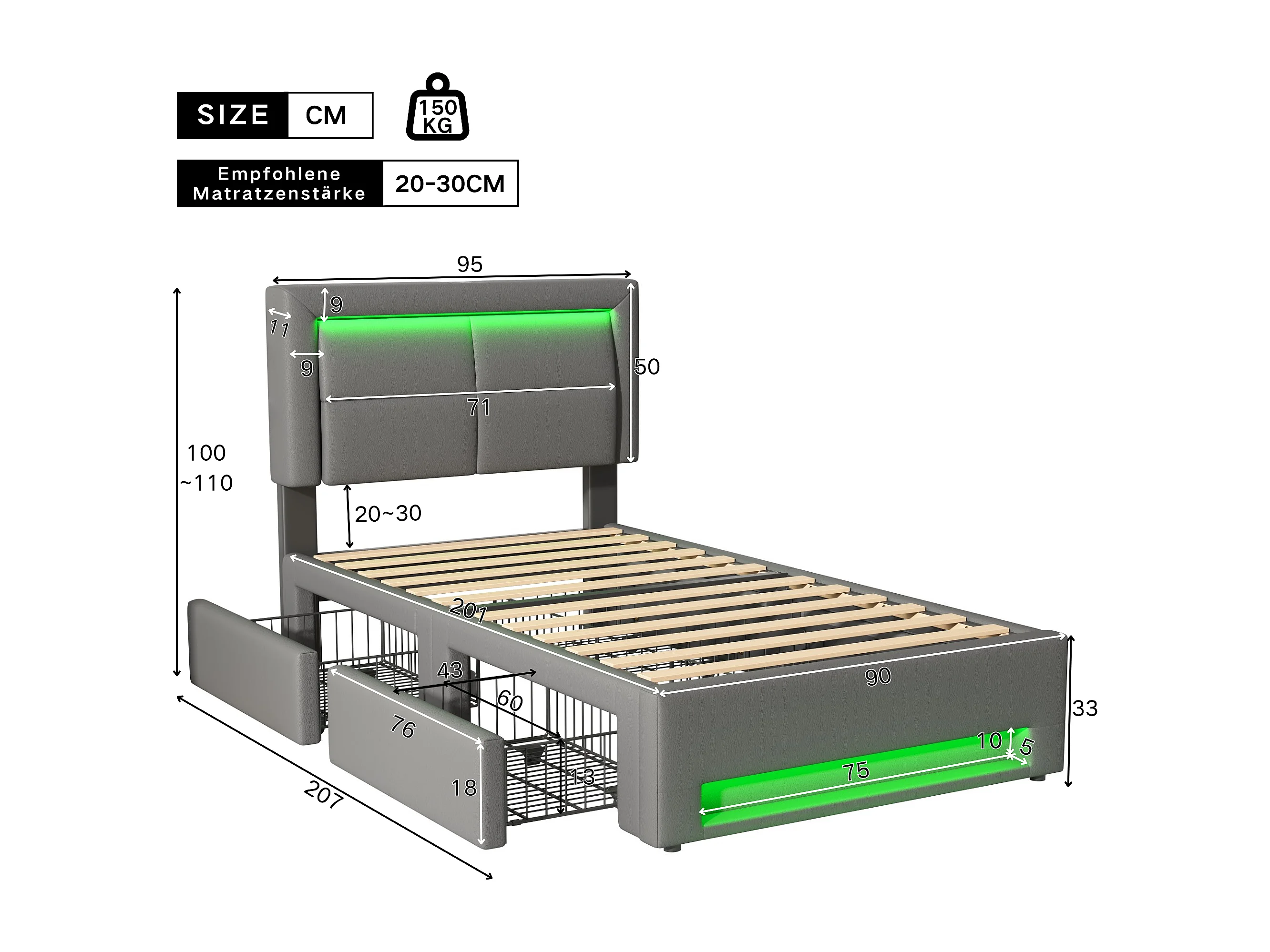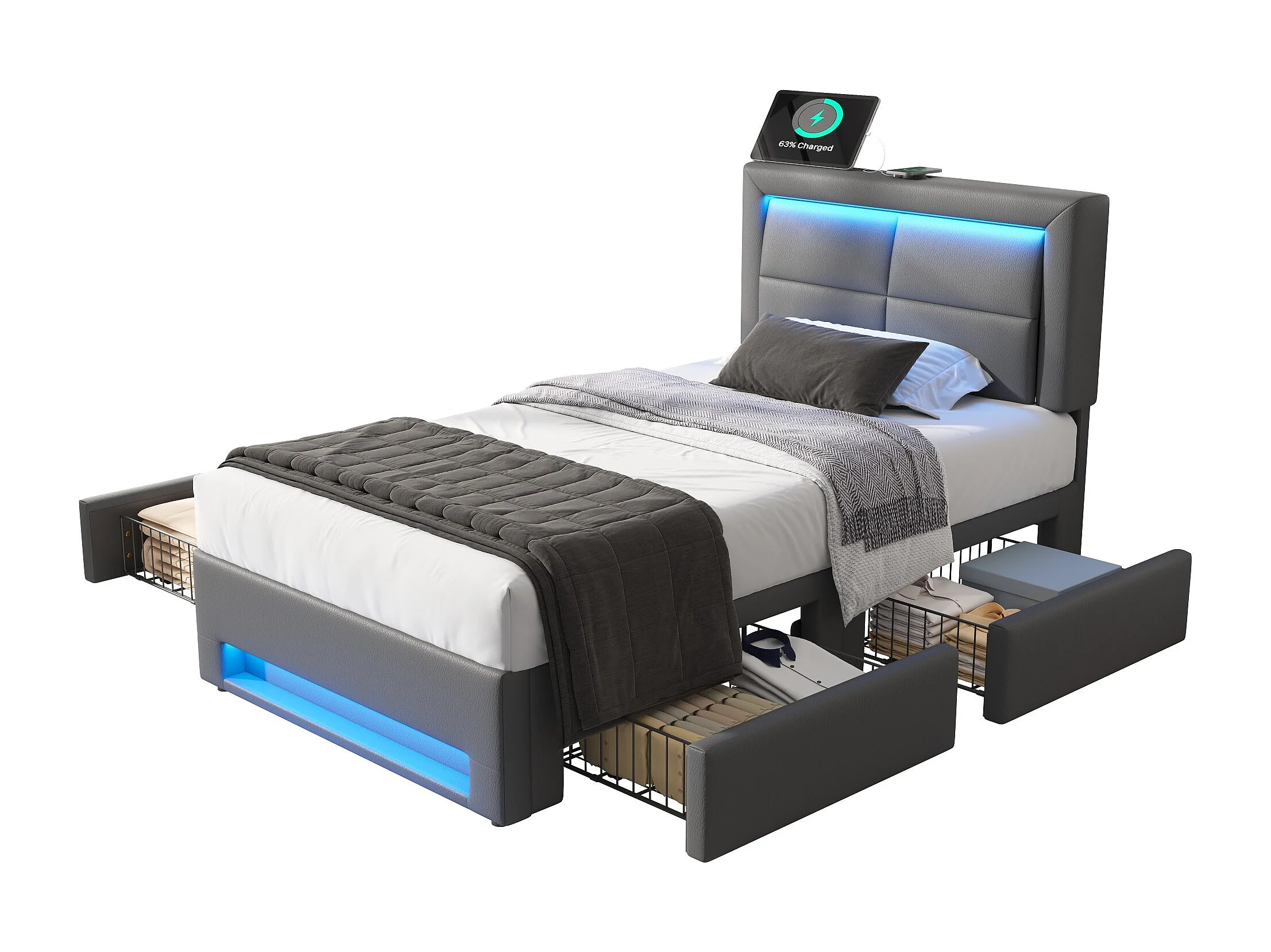 Lit adulte 90 x 200 cm avec port USB et Tête de lit réglable, LED et rangement, PU gris, sans matelas
