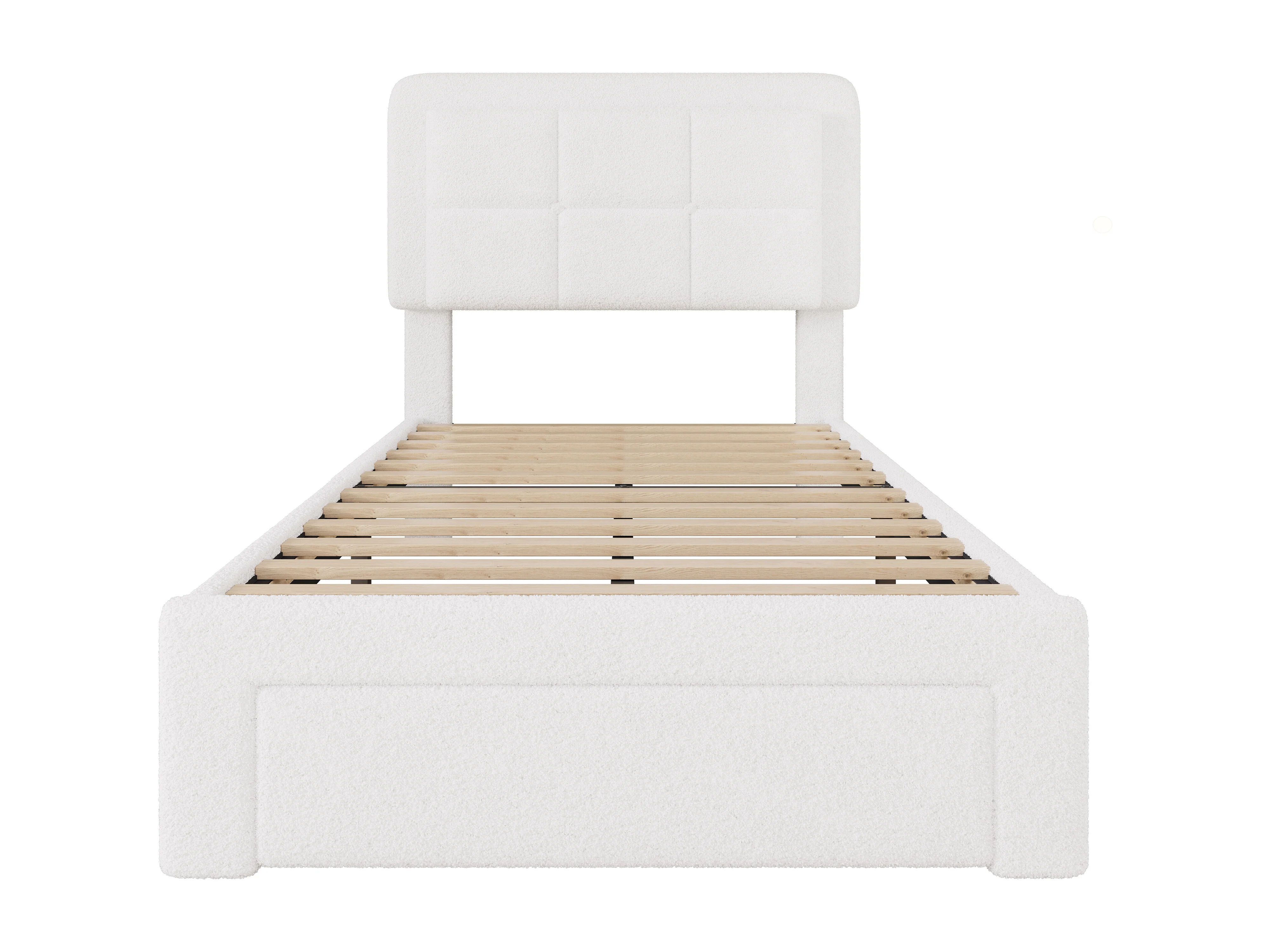 Lit adulte 90x200 cm avec port USB + LED, tissu teddy, cadre en fer et bois, tête de lit réglable, sans matelas