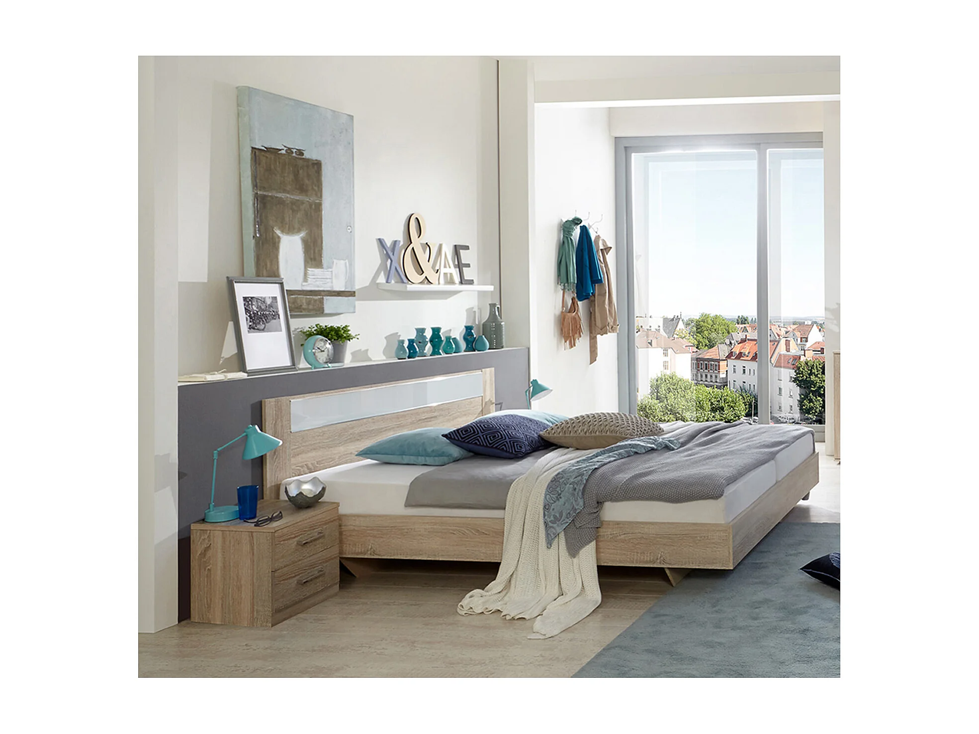 Lit adulte avec 2 chevets imitation chêne, rechampis verre blanc + chrome - Dim: 140 x 200 cm