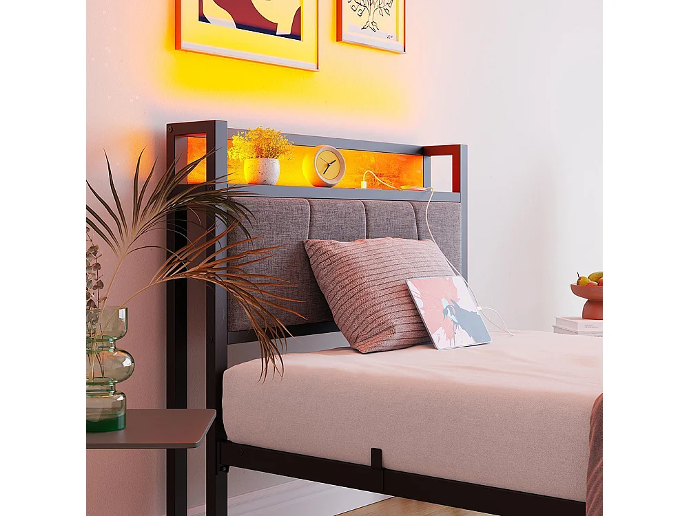 Lit adulte, avec éclairage LED intelligent, ports de recharge USB, structure métallique, marron-90 x 200 cm