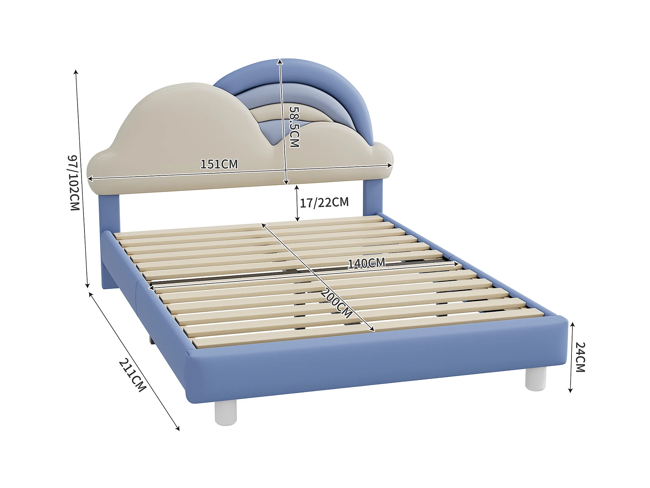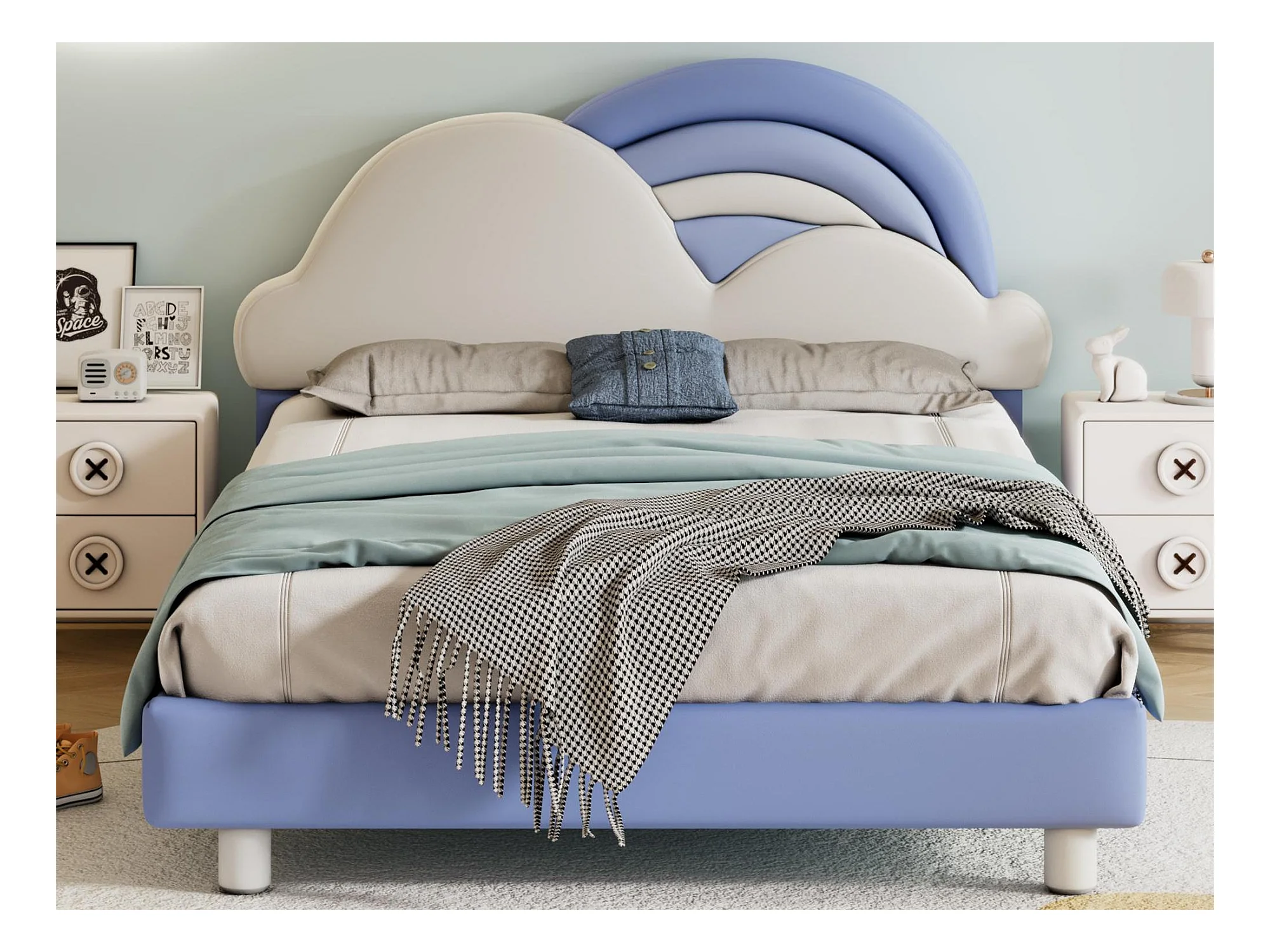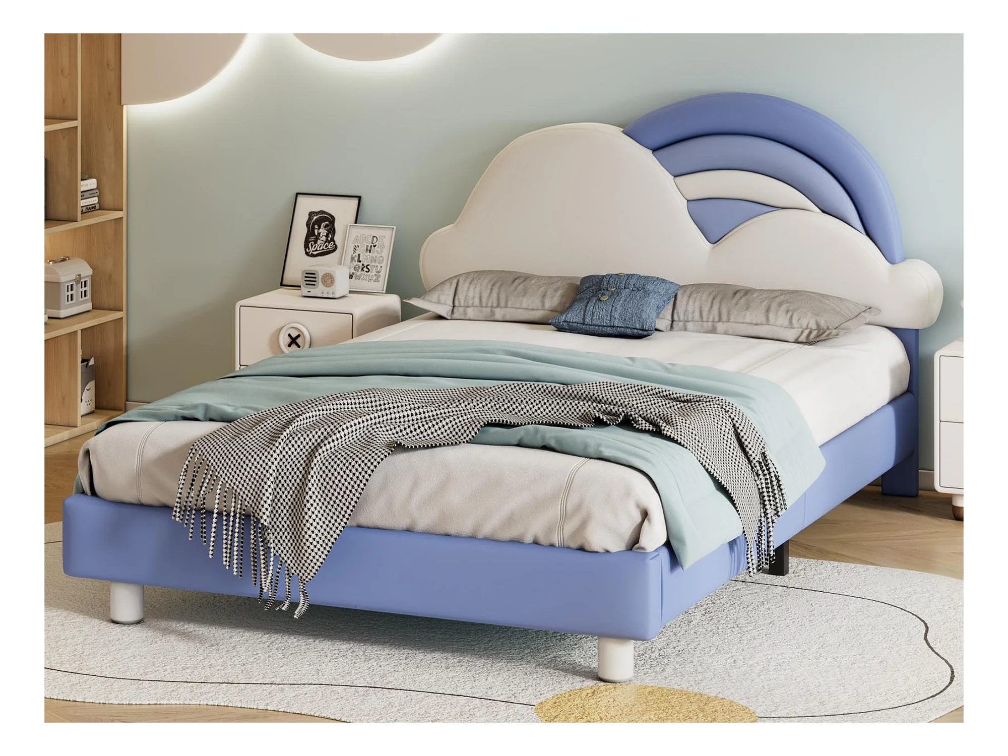 Lit adulte avec tête de lit en forme de nuage - 140 x 200 cm - similicuir - sommier à lattes en bois - bleu