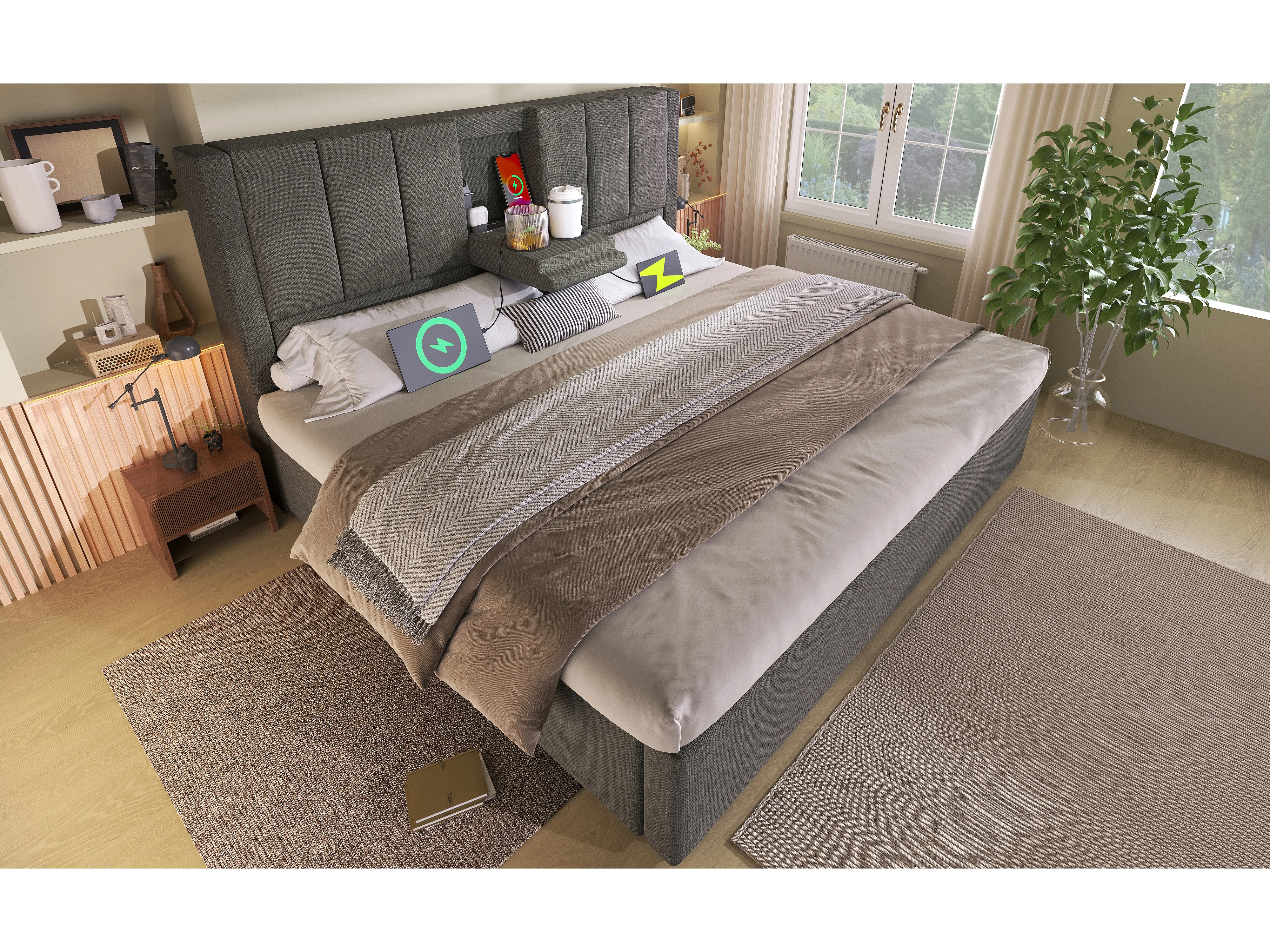 Lit adulte coffre 140x 200 cm avec porte-gobelet et 3 USB ,1 Type-C - Lin gris