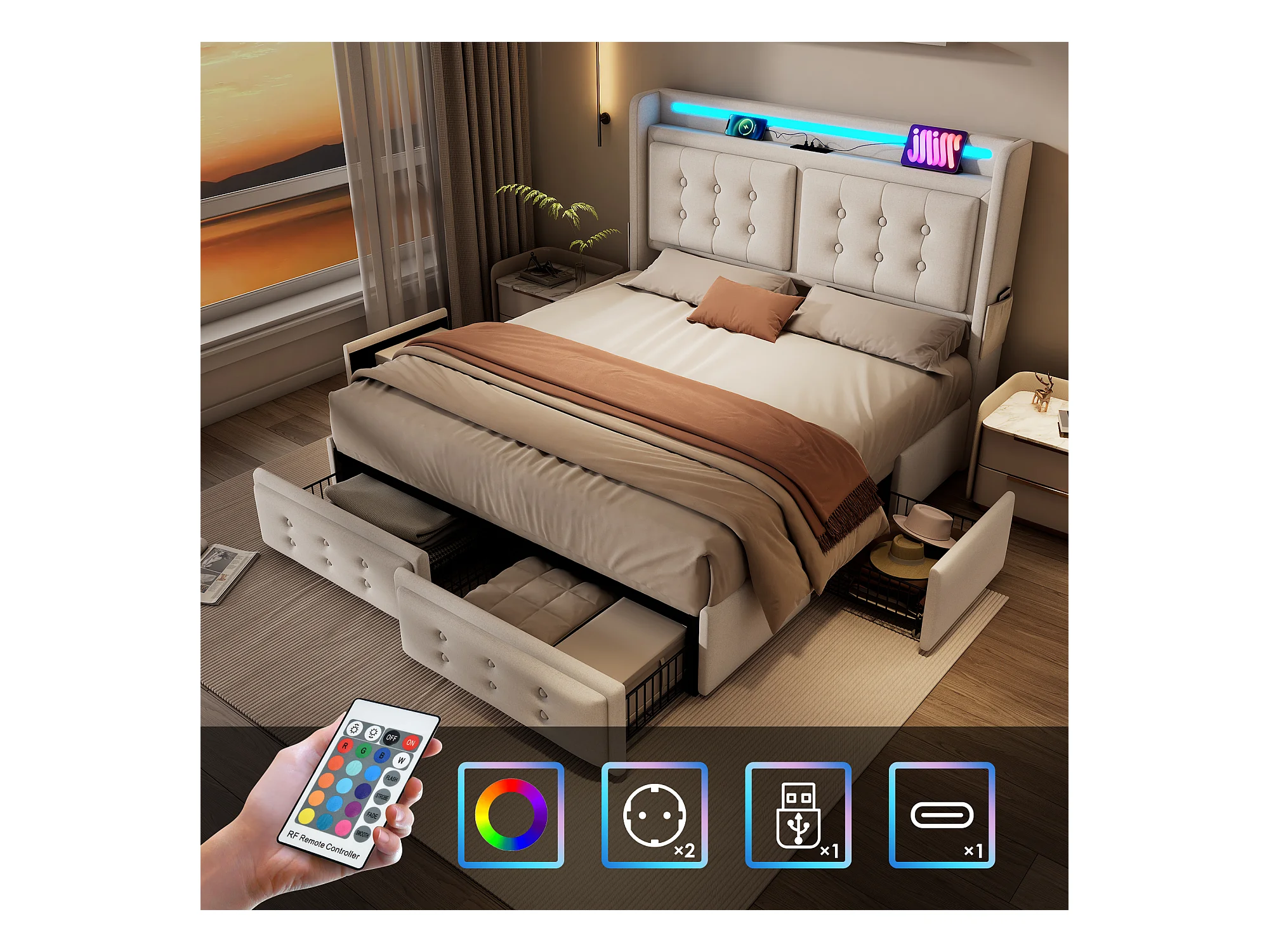 Lit adulte double 140x200 cm avec sommier et 4 tiroirs - tête de lit rembourrée LED et USB - coton - beige (sans matelas)