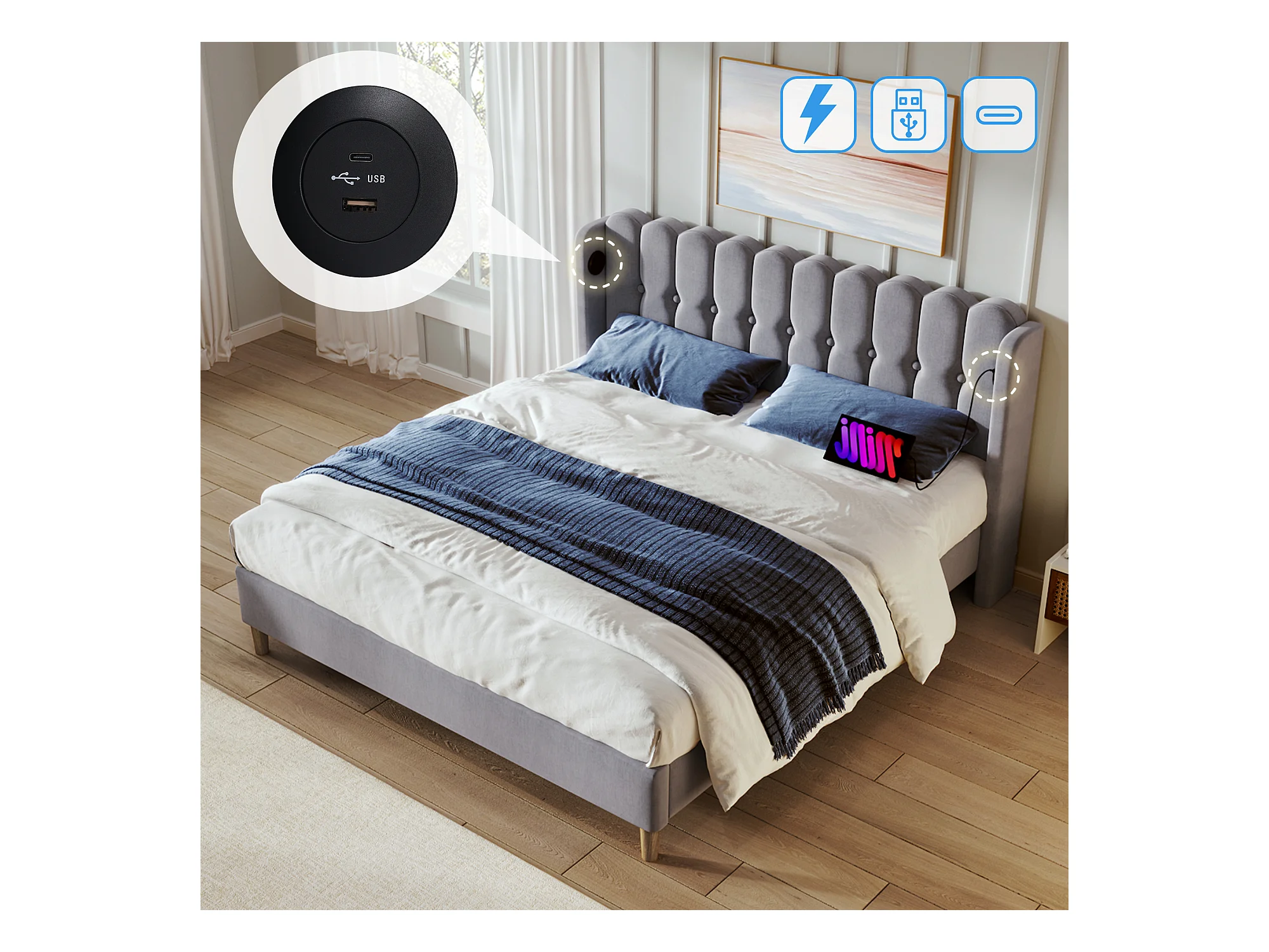Lit adulte 140x200cm avec sommier - tête de lit capitonnée avec USB - cadre de lit en bois - lin gris (sans matelas)