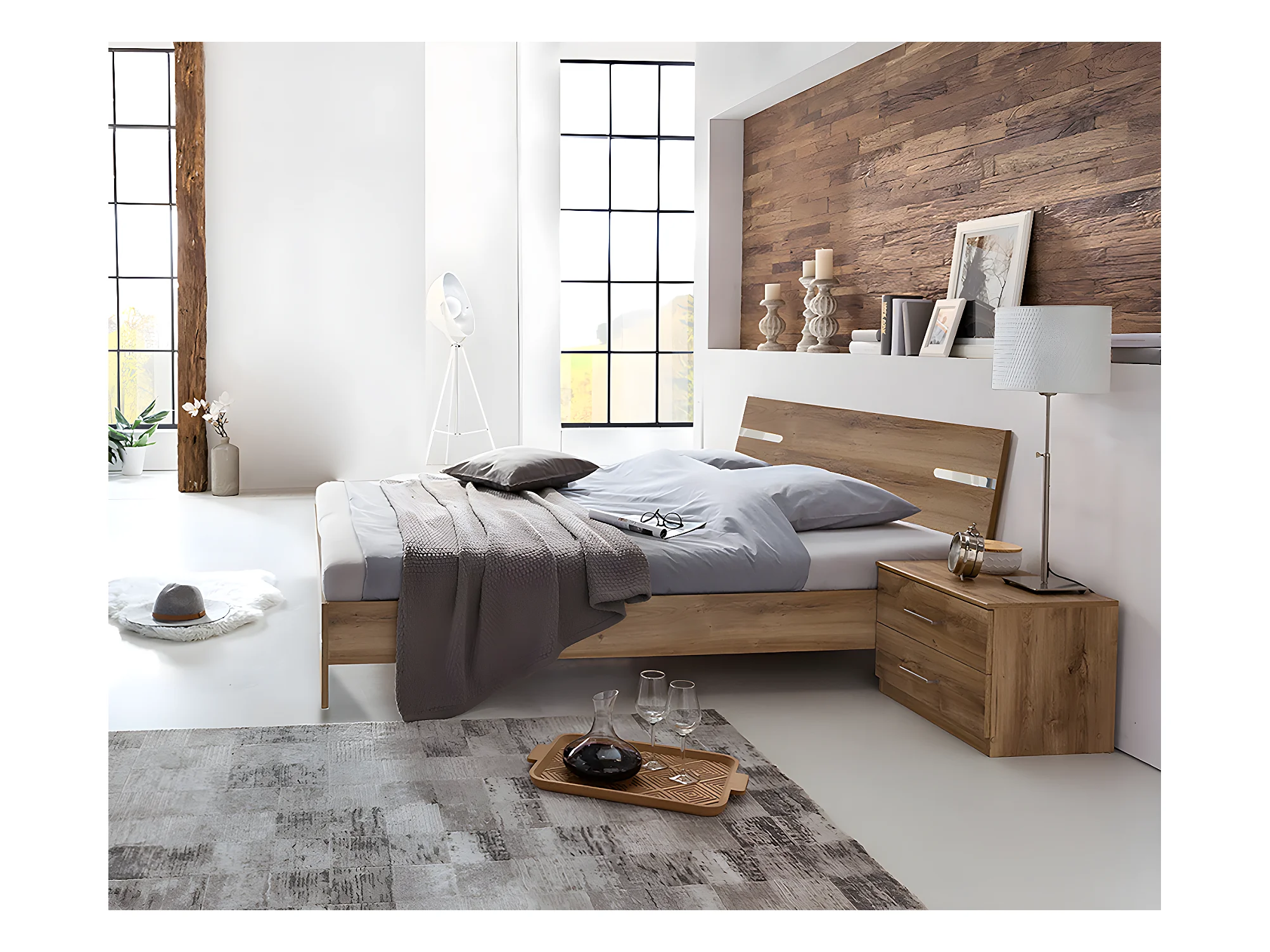 Lit adulte double 160 x 200cm + 2 chevets coloris imitation chêne poutre/chrome brillant