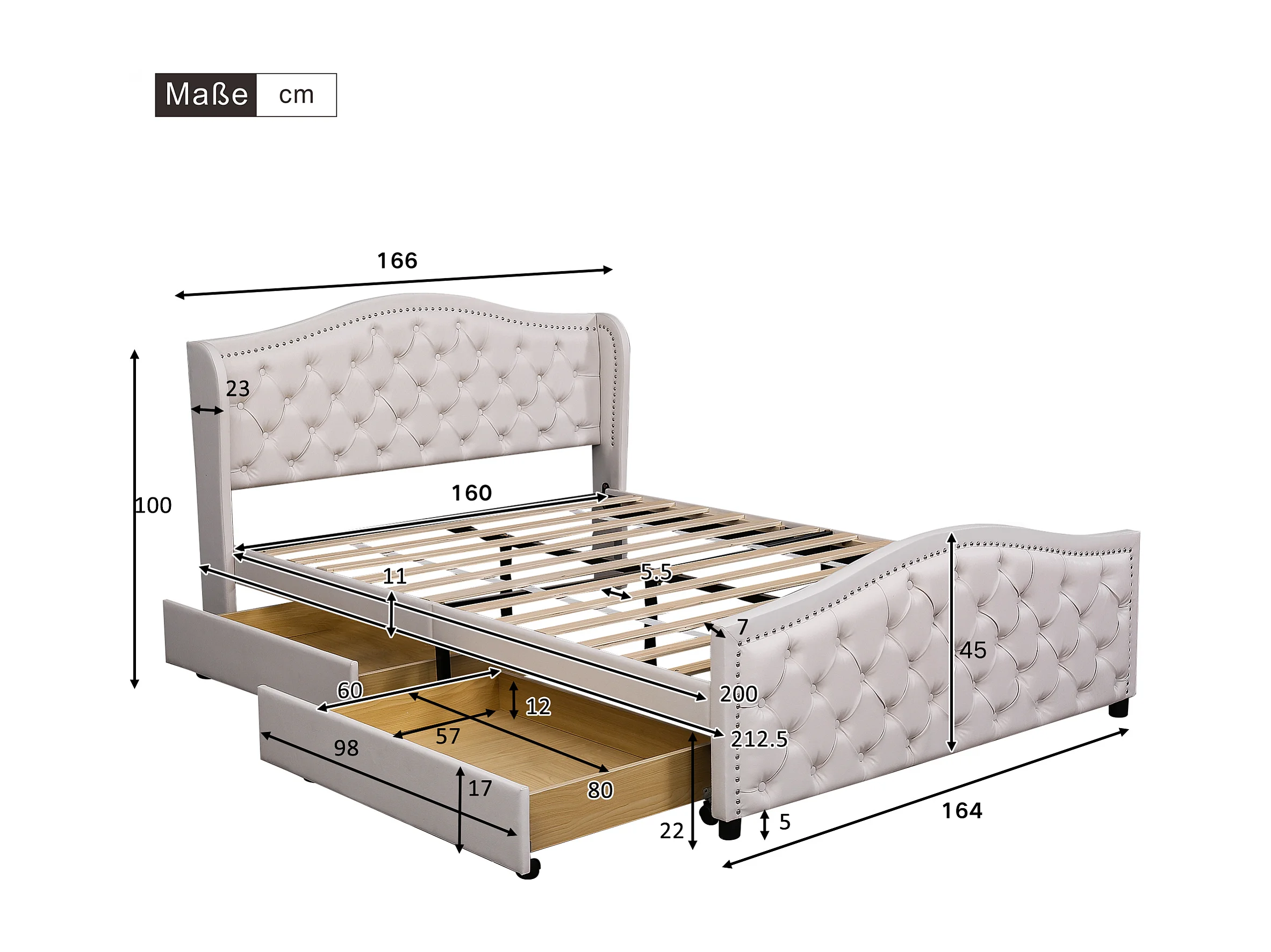Lit adulte double 160x200 cm blanc avec 2 tiroirs en pu, dossier moelleux, sans matelas, PU, blanc