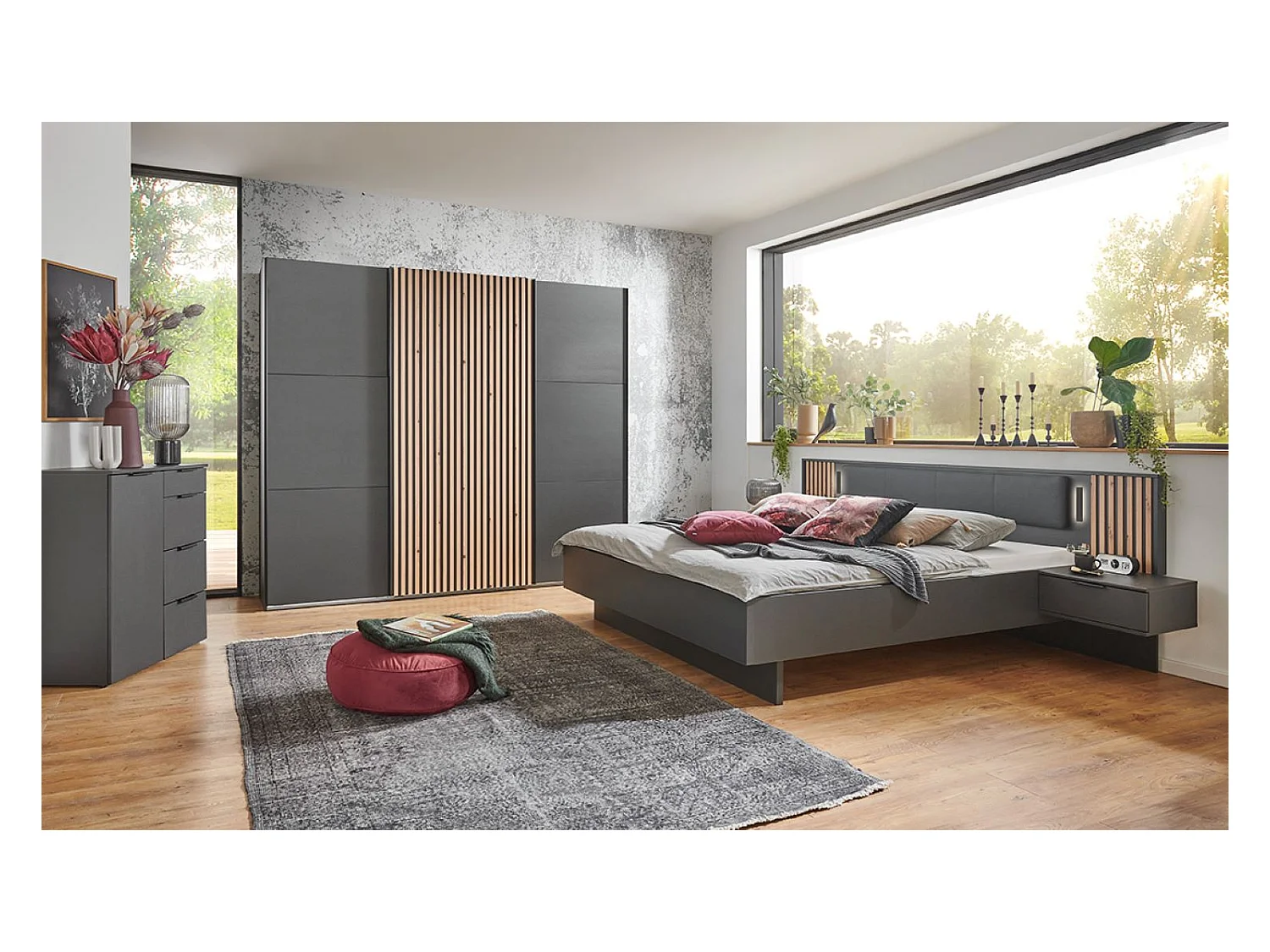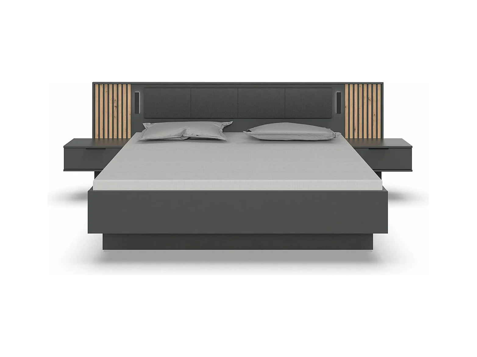 Lit adulte double 180 x 200 + 2 chevets coloris graphite, lamelles imitation chêne Artisan - Longueur 301 x Hauteur 104 x Profondeur 210 cm