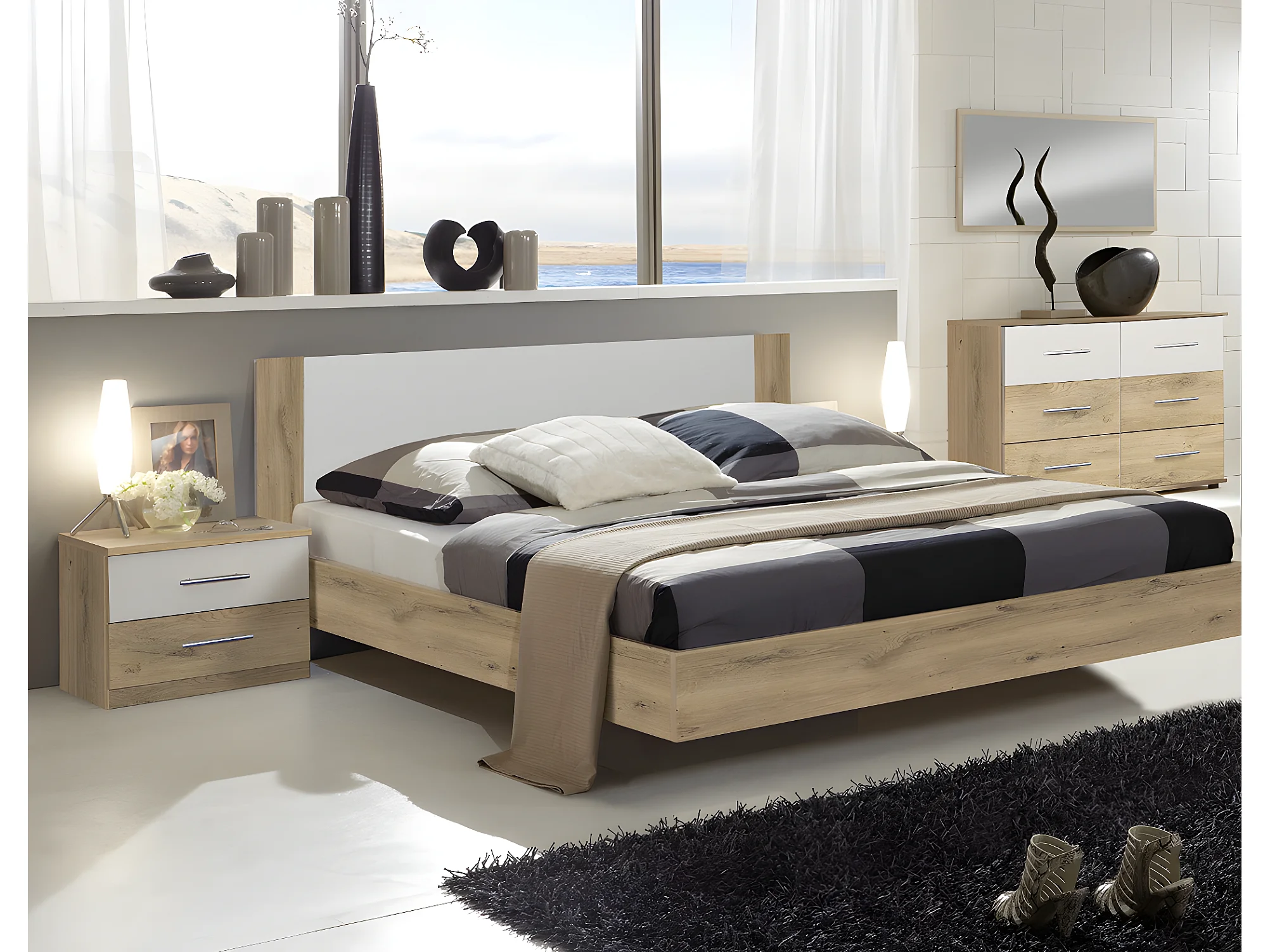 Lit adulte double + 2 chevets coloris imitation chêne poutre/blanc - L. 149 x P. 210 x H. 80 cm