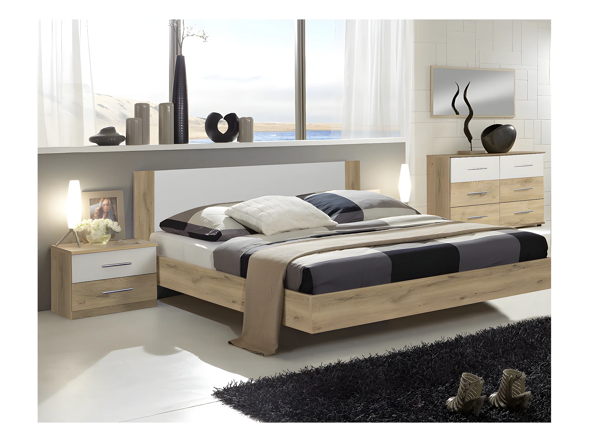Lit adulte double + 2 chevets coloris imitation chêne poutre/blanc - L. 169 x P. 210 x H. 80 cm