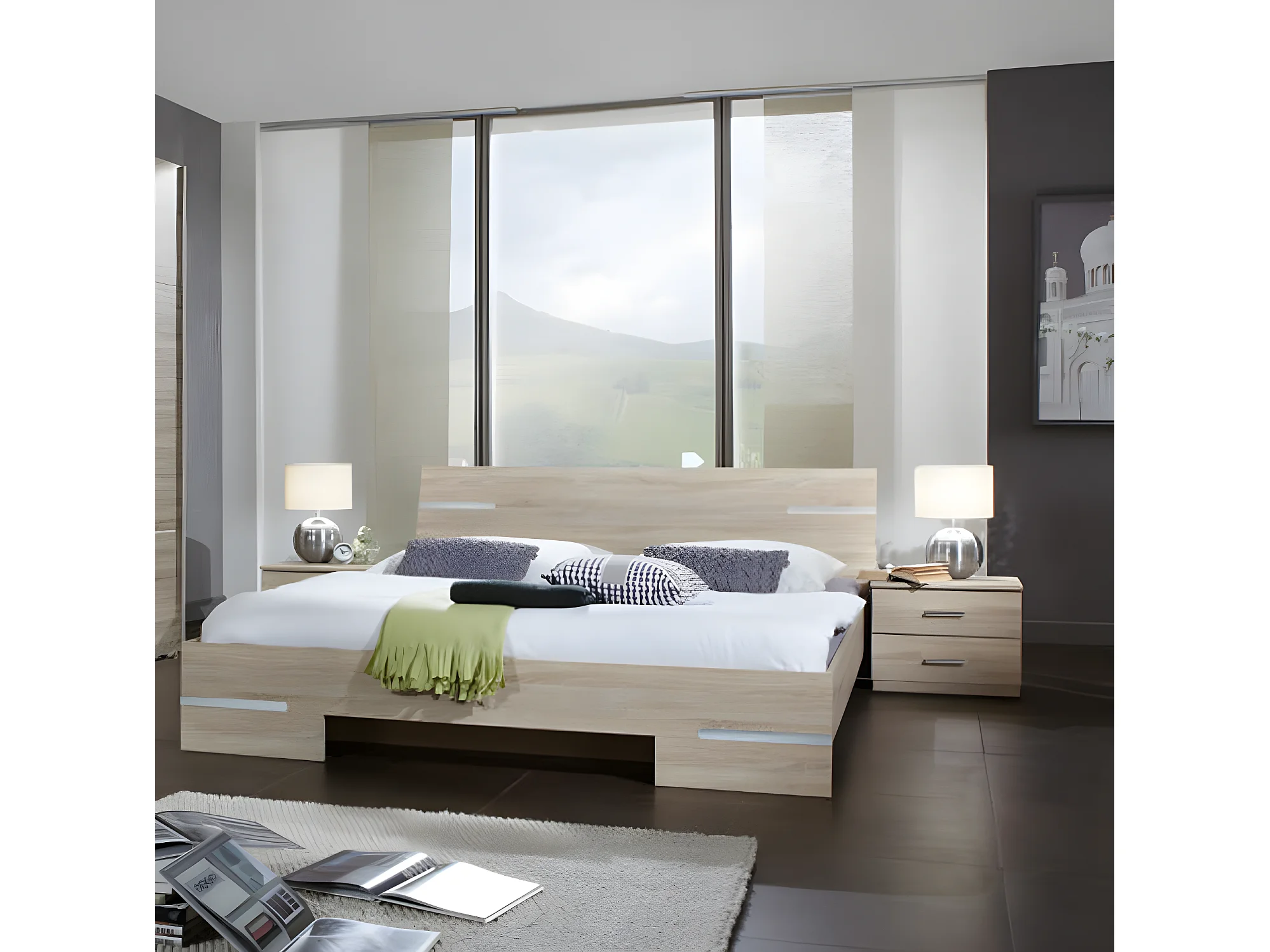 Lit adulte double + chevets coloris imitation chêne Artisan/chrome brillant