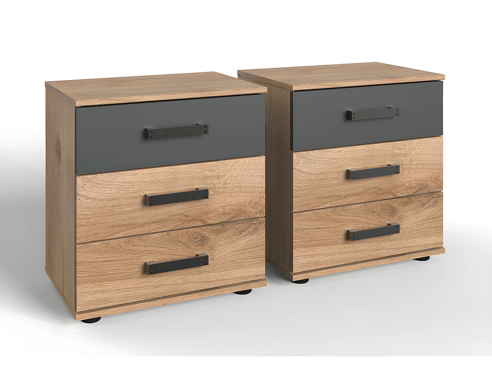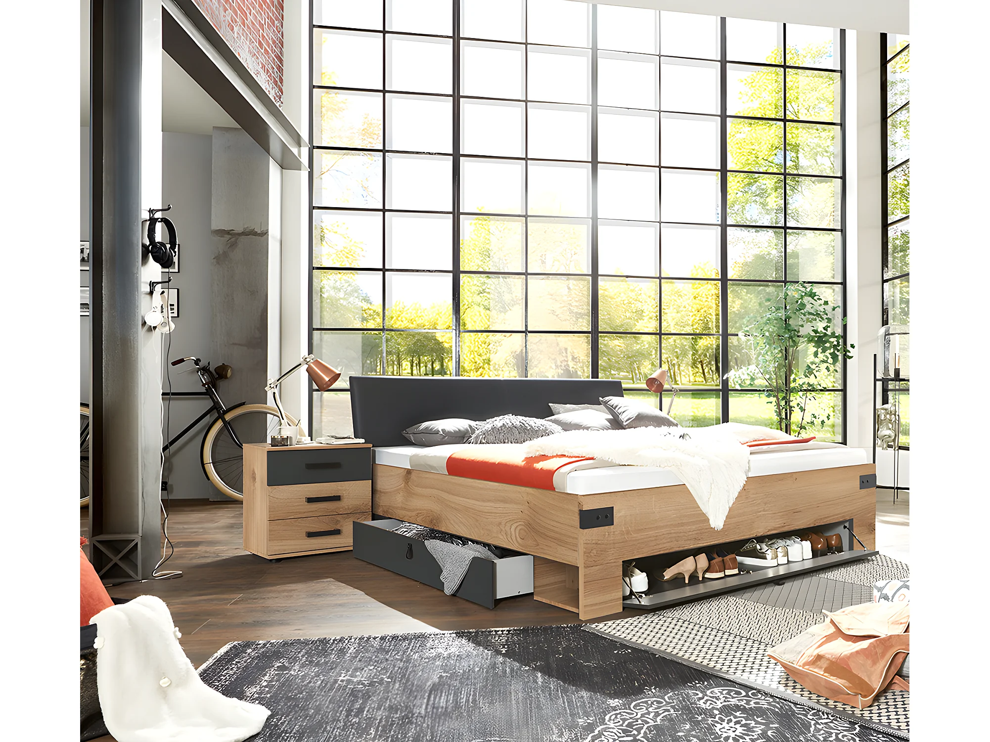 Lit adulte double Queen Size 160 x 200cm + 2 chevets coloris imitation chêne poutre/graphite