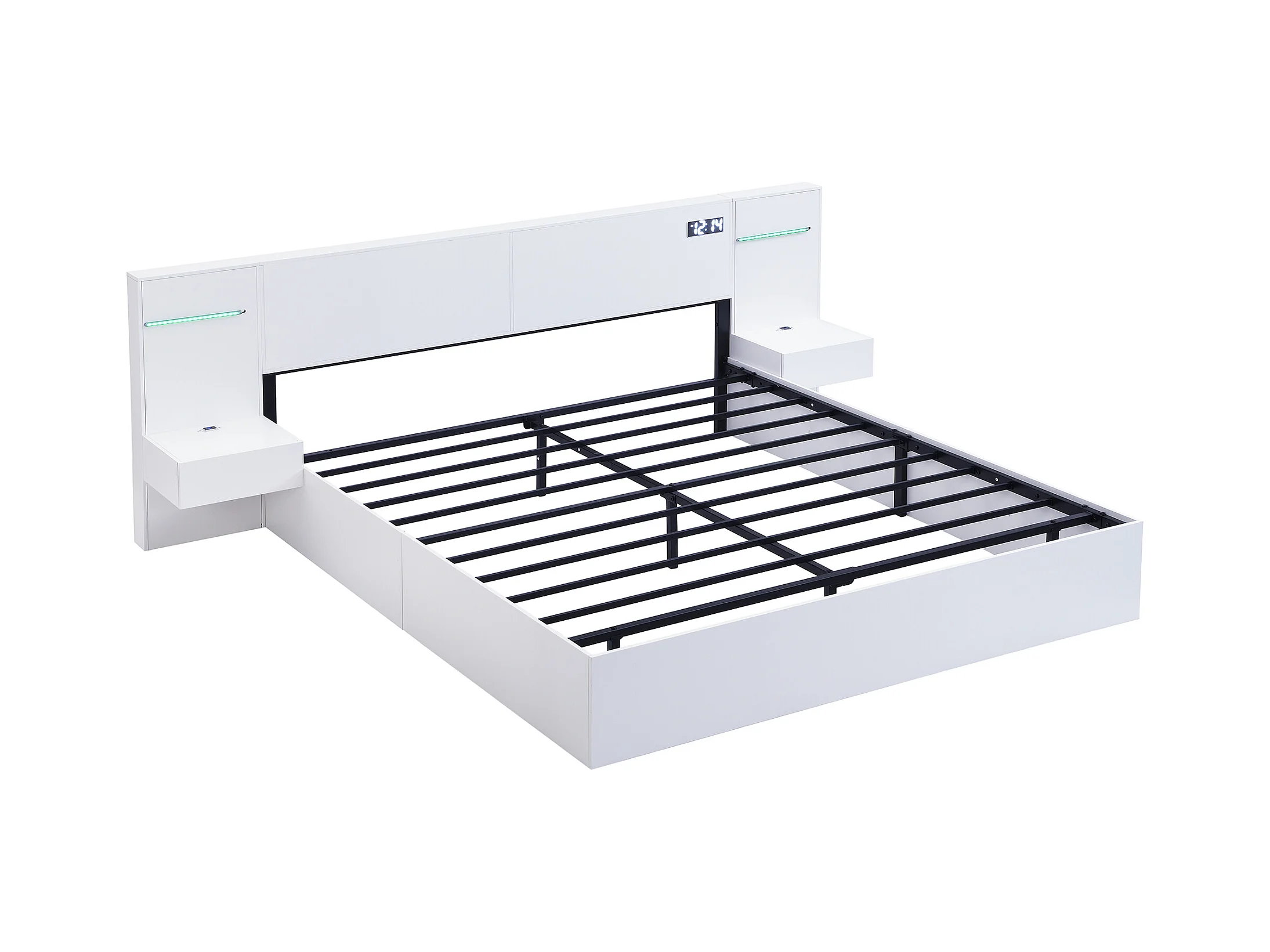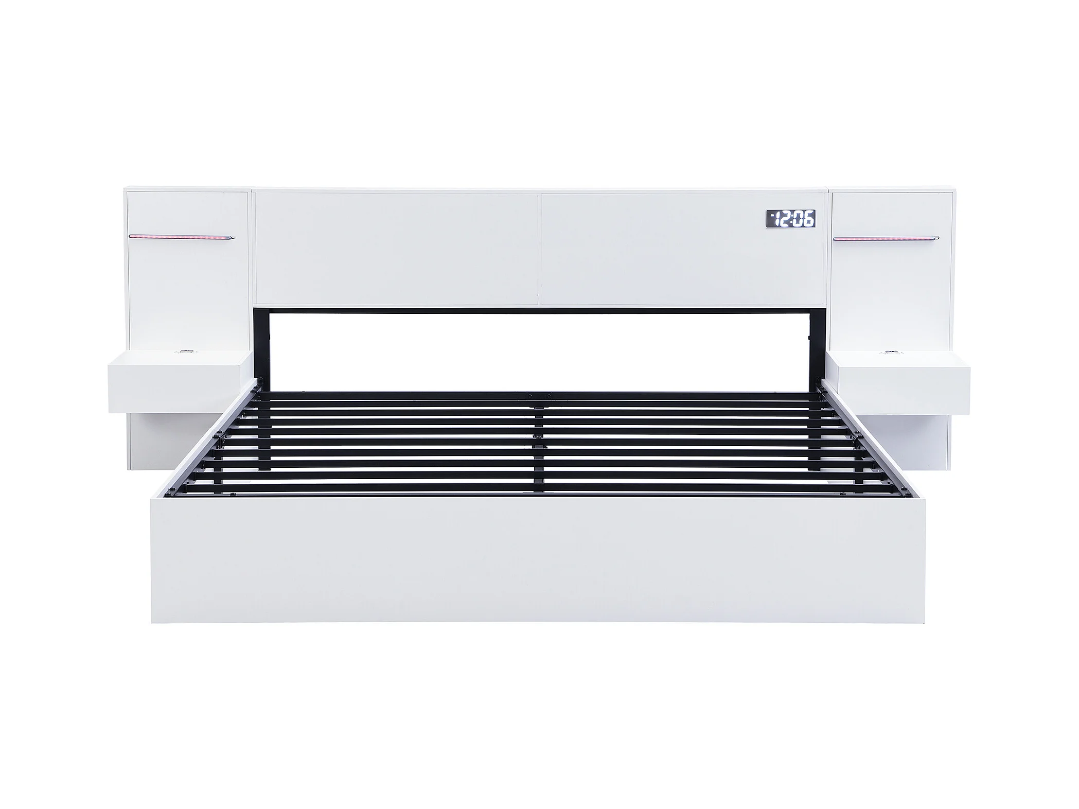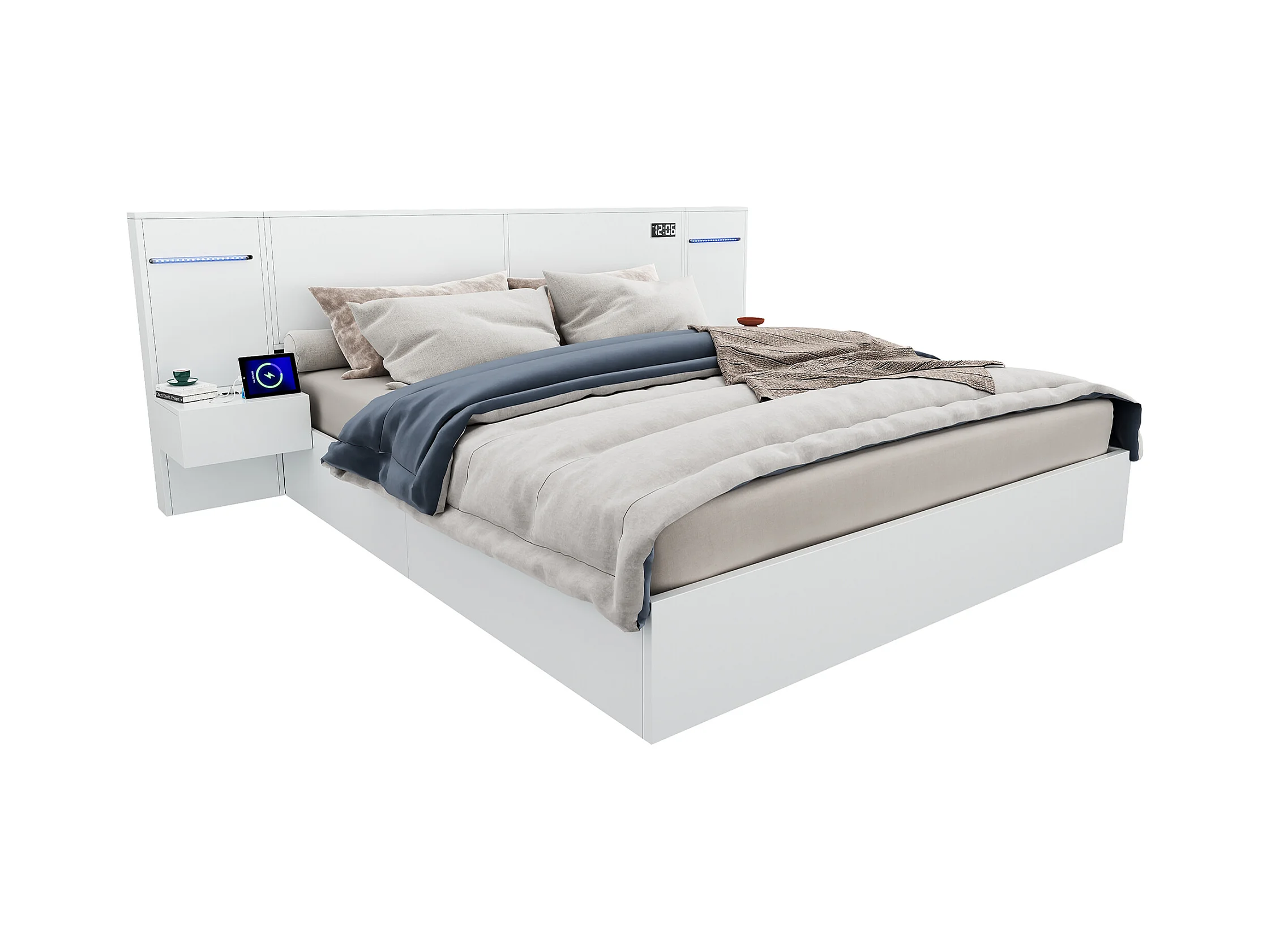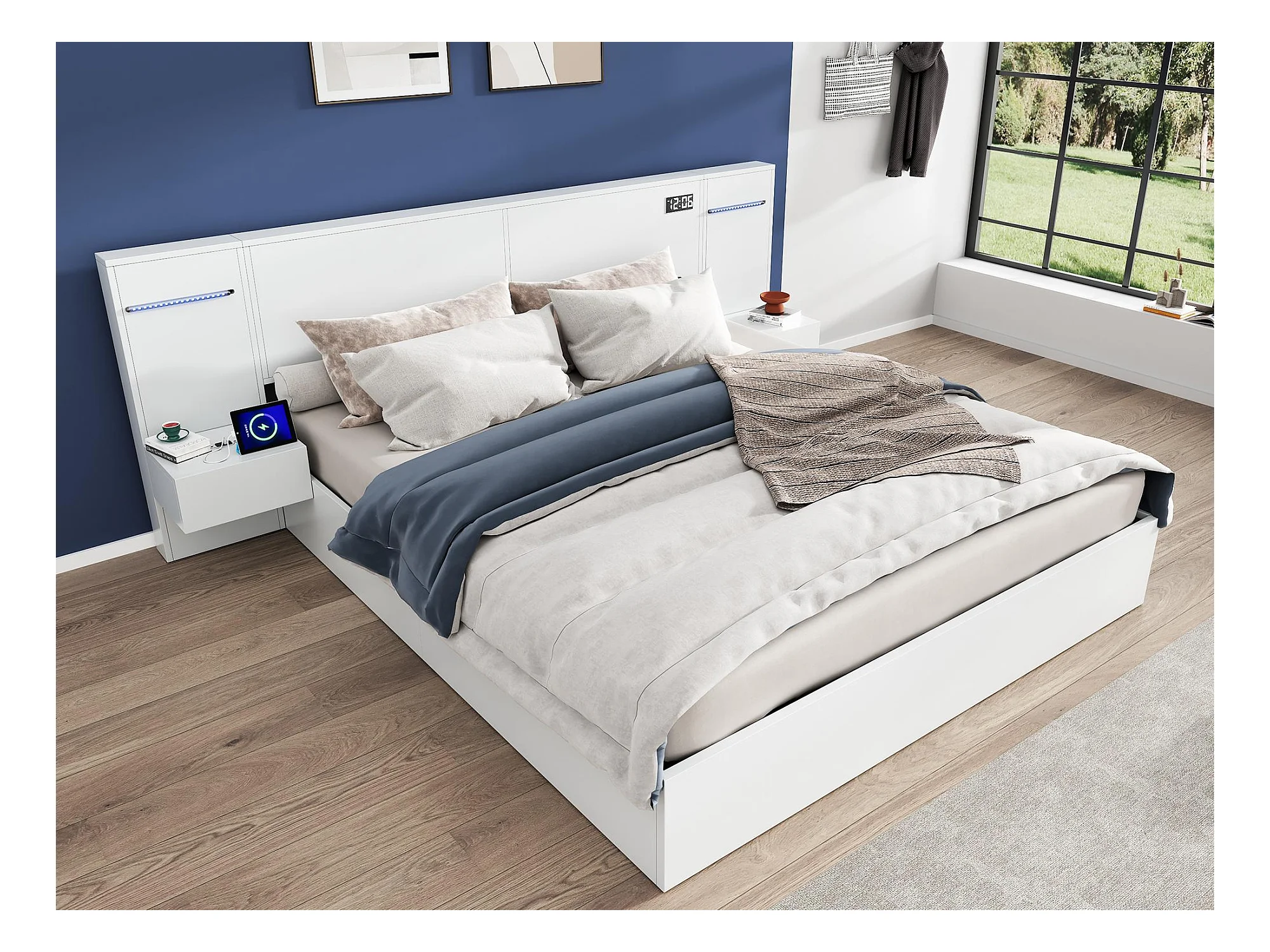 Lit adulte en bois 160x200 cm - avec 2 tables de chevet - avec port de chargement USB, haut-parleur Bluetooth et horloge numérique - Blanc