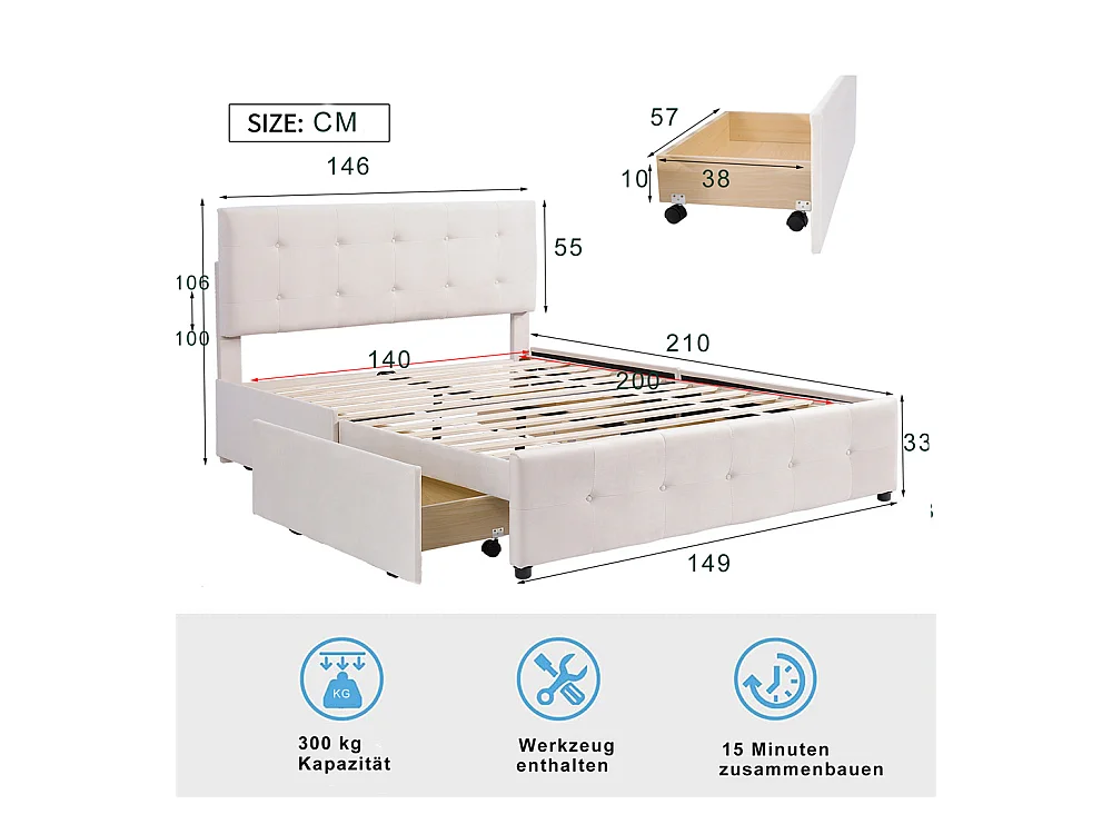 Lit adulte lit 140x200 cm lit rembourré avec tiroirs et sommier à lattes lit double velours beige