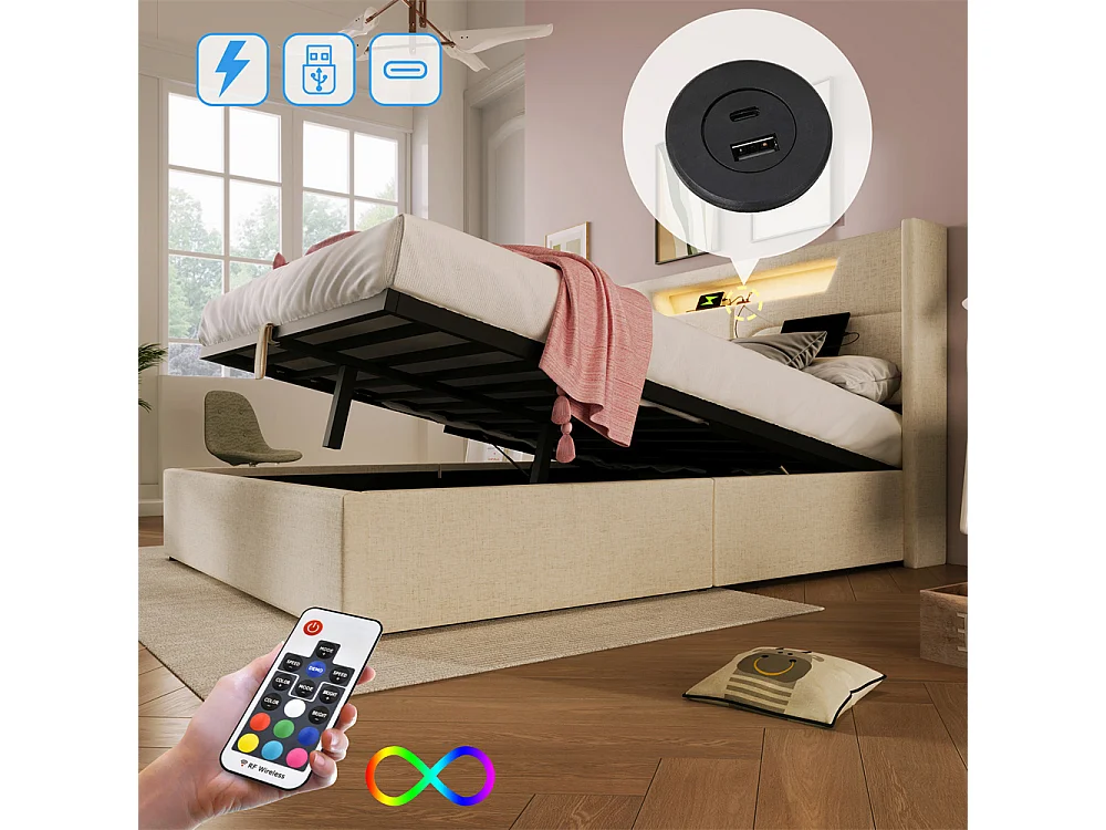 Lit adulte lit 140x200 cm lit rembourré lit de rangement lit sommier à lattes en bois lit double lin beige
