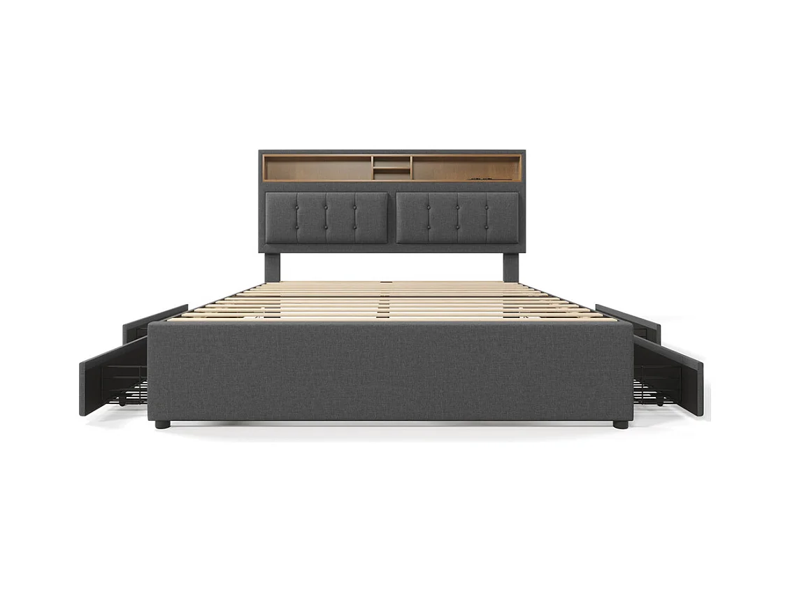 Lit adulte lit 160x200 cm lit rembourré avec quatre tiroirs avec sommier à lattes en bois lit double lin gris