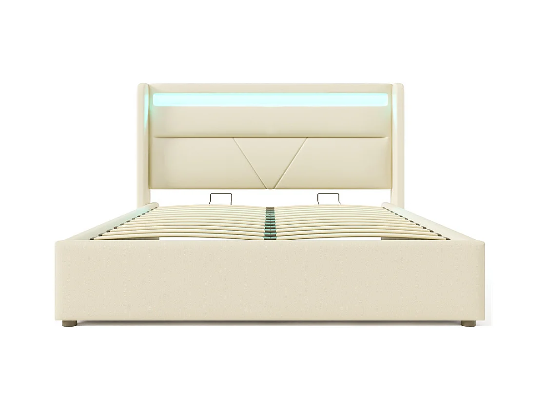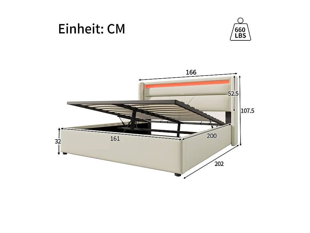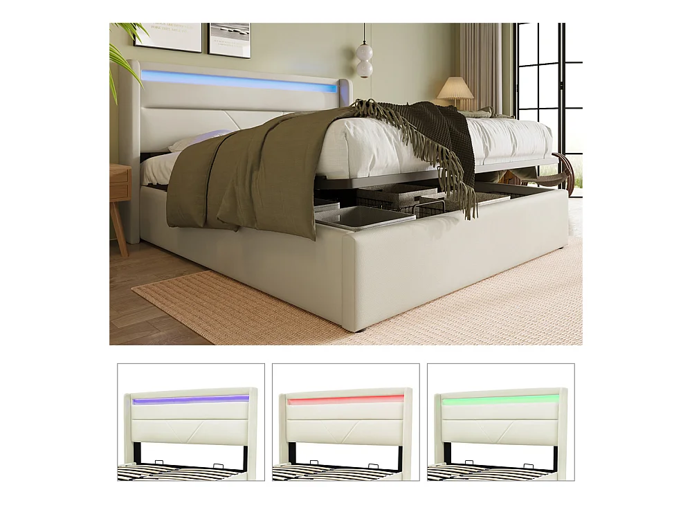 Lit adulte lit 160x200 cm lit rembourré hydraulique lit de rangement lit barre d'éclairage led lit double pu blanc