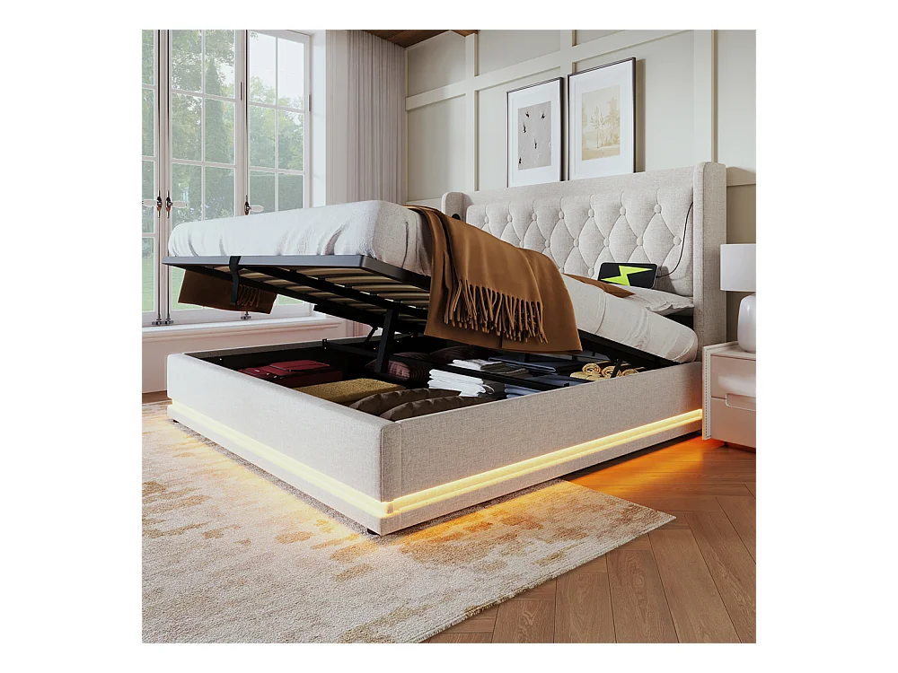 Lit adulte lit 160x200 cm lit rembourré hydraulique lit de rangement lit double coton beige