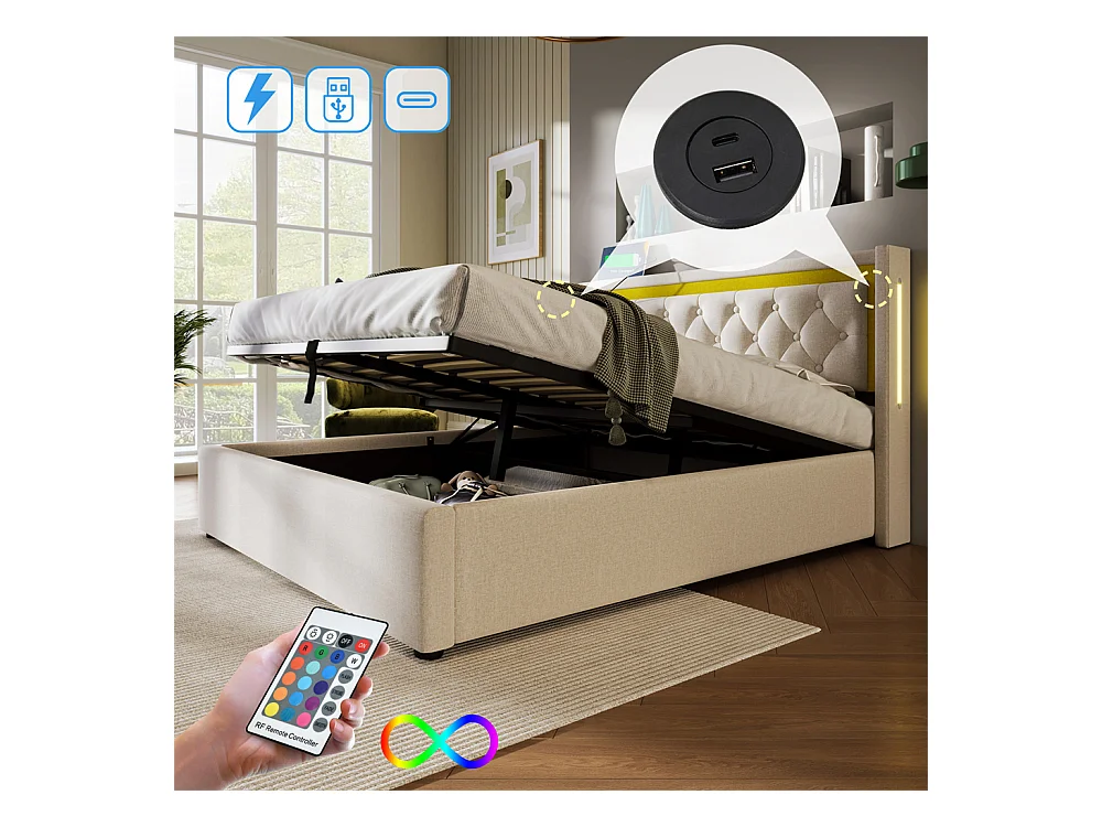 Lit adulte lit 160x200 cm lit rembourré lit de rangement lit sommier à lattes en bois lit double coton beige